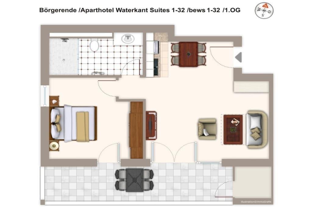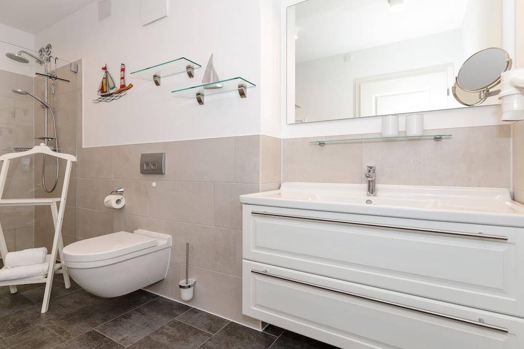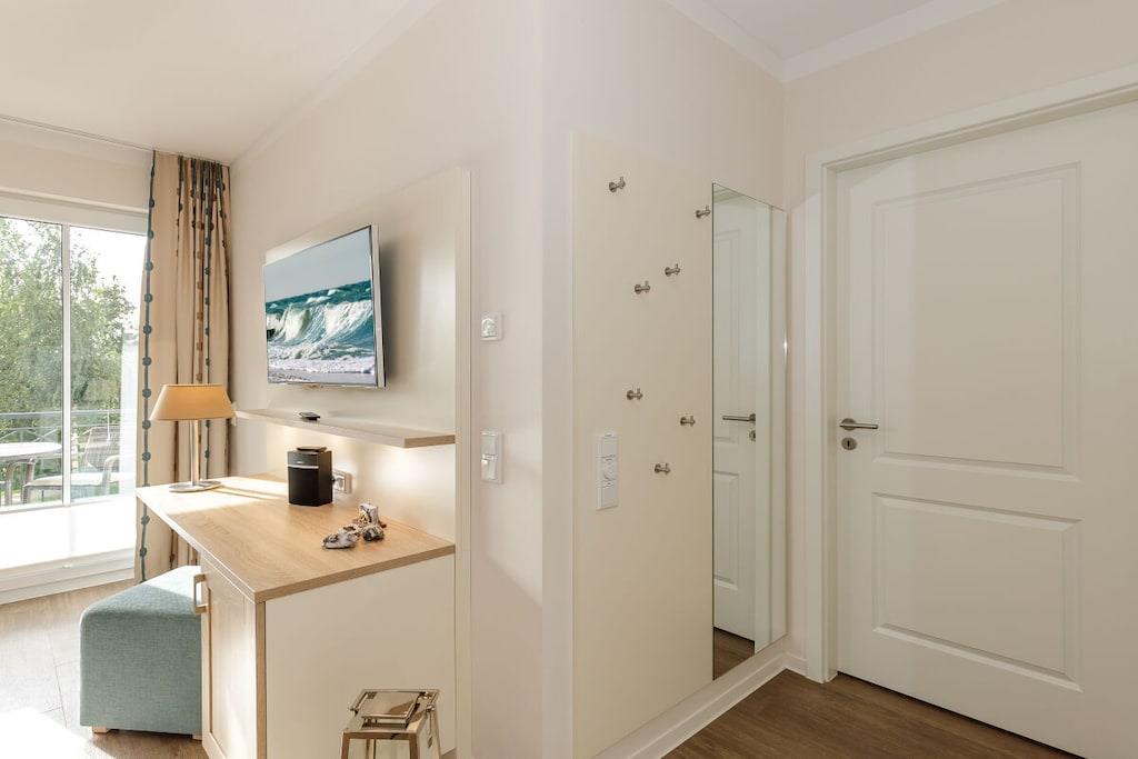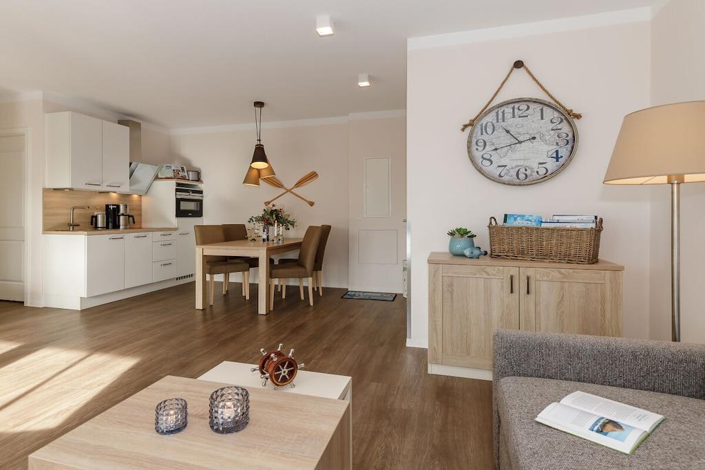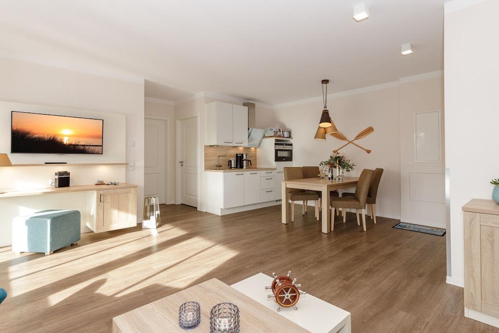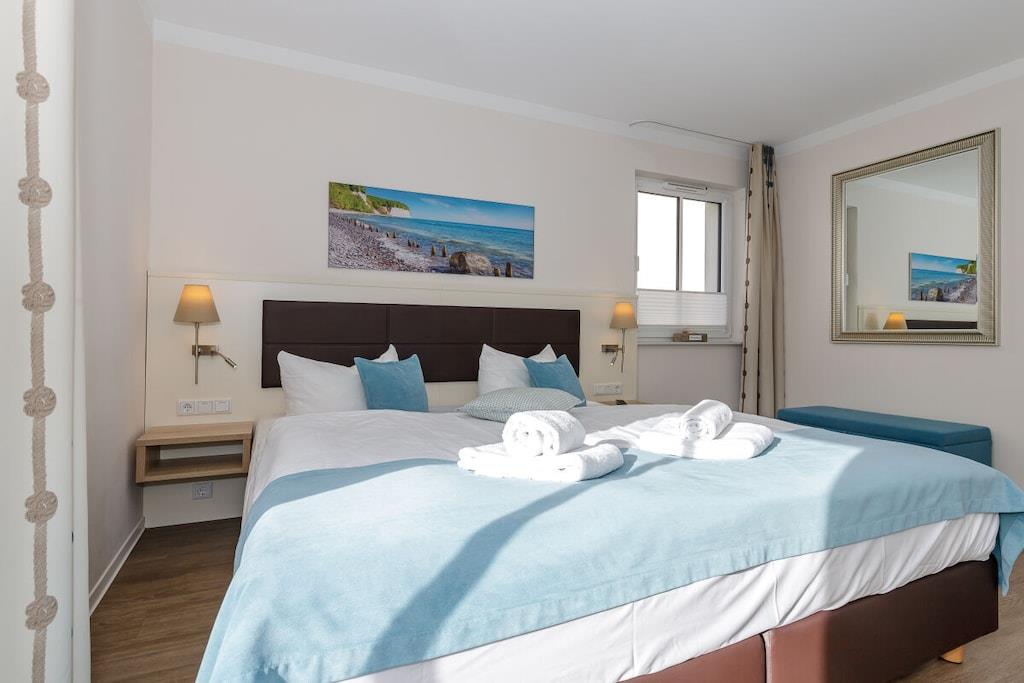 Die 57 m² große 2-Zimmer Ferienwohnung ist für bis zu 4 Personen geeignet. Besonders hervorzuheben ist der sonnige und nach Süden gelegene Balkon mit eingeschränkten seitlichem Meerblick. Hier können Sie das wohltuende Meeresklima der Ostsee beim Sonnenbaden genießen. Auch Vierbeiner sind hier herzlich willkommen! Die lichtdurchflutete und großzügig konzipierte Ferienwohnung verfügt über kostenfreies WLAN und eine voll ausgestattete offene Küche mit Essbereich. Im Wohnbereich befindet sich eine Doppelschlafcouch, ein Flatscreen-TV und eine HiFi-Anlage. Das separate Schlafzimmer ist mit einem modernen Boxspringbett ausgestattet. Im Badezimmer befinden sich eine großzügige begehbare Regendusche, ein Waschtisch mit Föhn und Kosmetikspiegel sowie ein Handtuchwärmer.