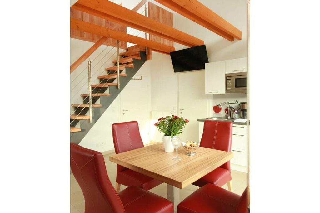 In der 1. Etage: (Wohn-/Schlafzimmer(, Schlafcouch 1 Pers., TV), Badezimmer(, Toilette, Dusche, Waschbecken, Heizung)) In der 2. Etage: (Galerieschlafzimmer) , , , Internet, Trockner, Waschmaschine, Balkon(Gartenmöbel), Heizung, Parkplatz, Bügelbrett, Bügeleisen