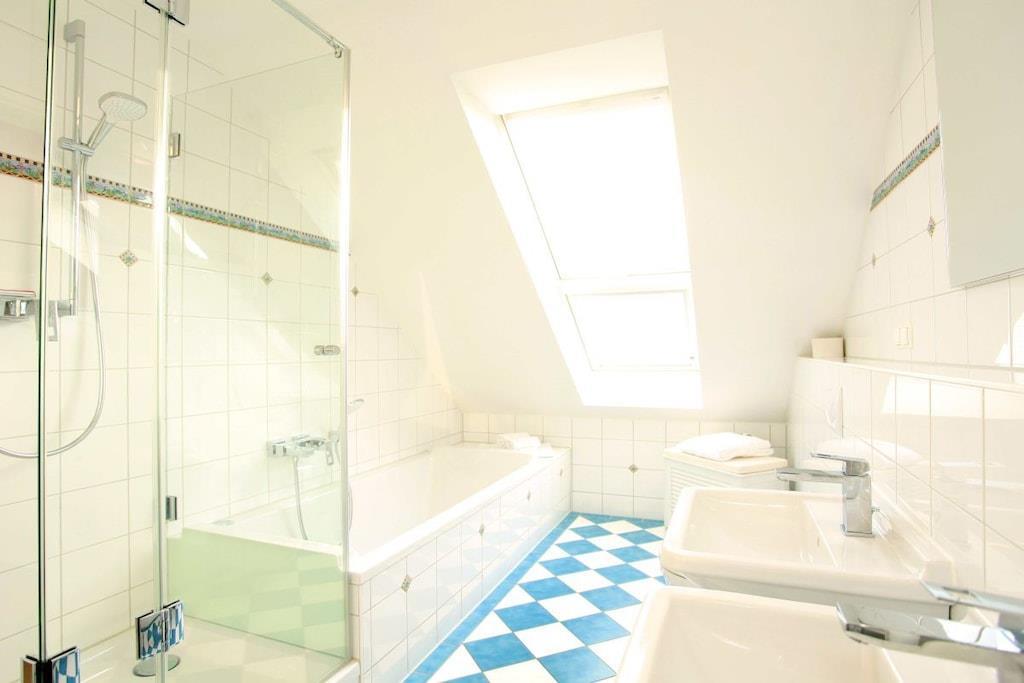 Exklusives Ferienhaus, ca. 200 qm, moderner Wohnkomfort. Das Beach House ist ideal für Gruppen und Familien. Der großzügige Wohn- und Essbereich im Erdgeschoss und die vollausgestattete offene Küche bieten sehr viel Platz zum Beisammensein und gemeinsamen Kochen. Das Obergeschoss bietet herrliche Aussicht auf das Meer. Das Ferienhaus bietet drei Schlafzimmer mit großen Doppelbetten (2x1,80m breit 1x1,60m breit), einen Galeriebereich mit großem Doppelbett (1,60m breit) sowie vier hochwertigen Sofabetten (3 x 1,60m, 1 x 1,40m breit mit Lattenrost und Matratzen), 4 moderne und großzügige Bäder, sonnige Terrasse, schöne Gartenmöbel, Garten, 2 Kaminöfen, 3D-Smart-TV, im Hauswirtschaftsraum stehen Waschmaschine und Trockner (jeweils mit Münzautomat) zur Verfügung, Kinderhochstuhl, Reisebettchen. Die Erdgeschosswohnung ist barrierearm und mit Rollstuhl oder Rollator gut nutzbar. 3 Pkw-Stellplätze.