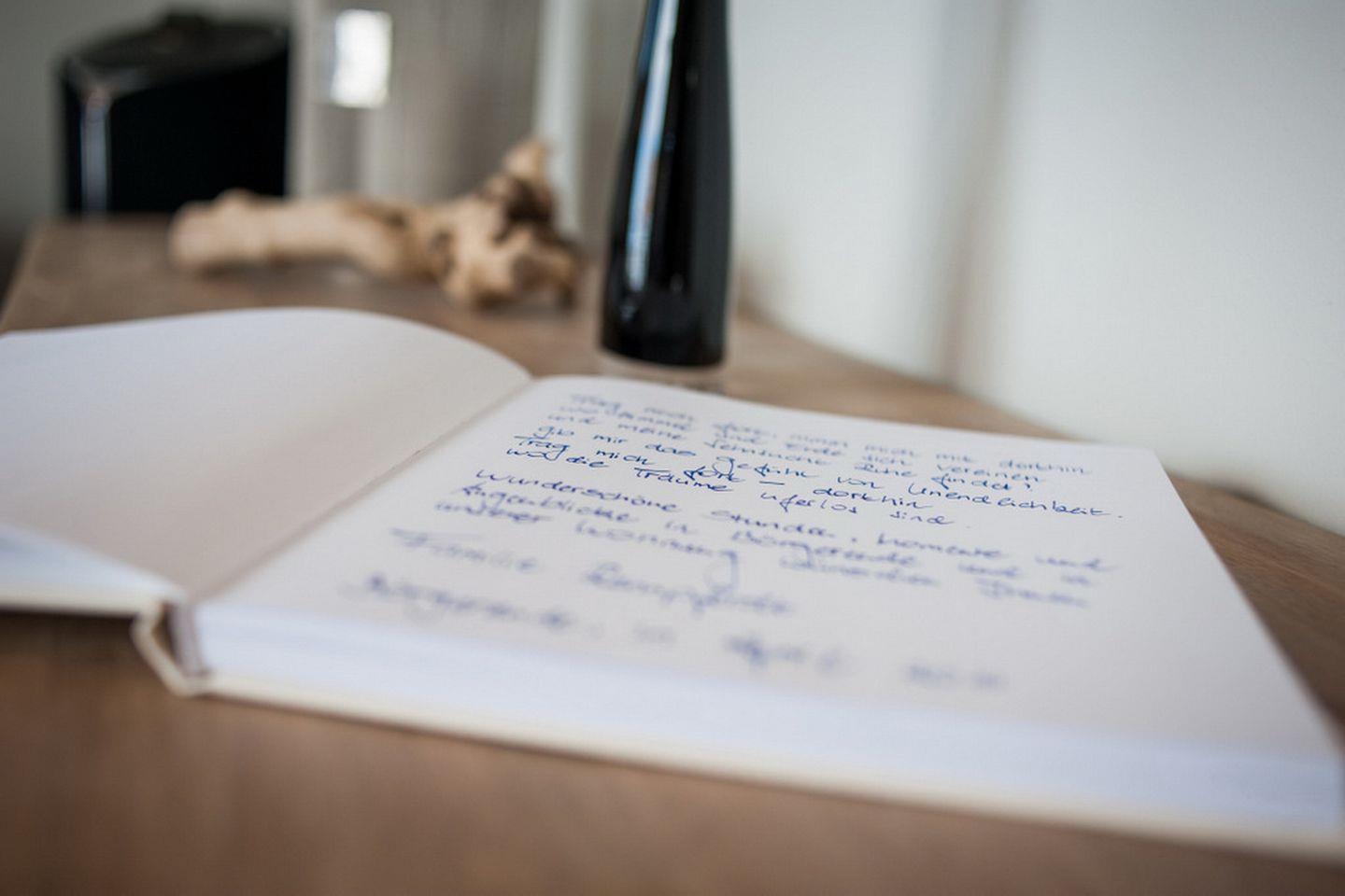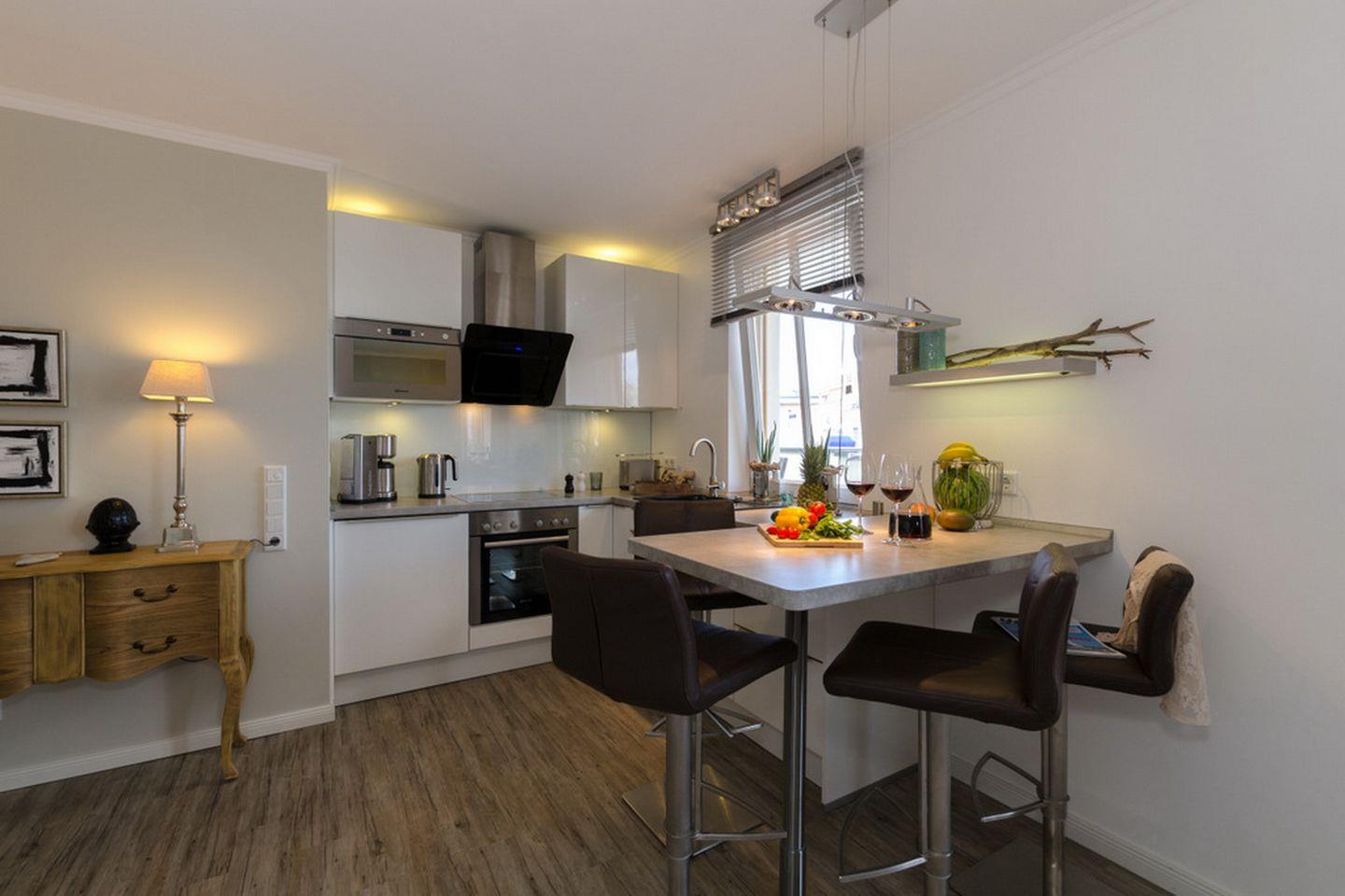 Der Wohnbereich ist mit Kamin, einer Schlafcouch (160 x 200 cm), Flachbild-TV, BlueRay-Player, CD-Radio, kleine Bücher- und Spielesammlung und einer offenen Küche mit Tischtresen und Barhocker ausgestattet. Genießen Sie aus den großen Fenstern oder direkt von der großen Dachterrasse einen sehr schönen Blick auf die Ostsee. Erleben sie auch in der kalten Jahreszeit unvergesslich schöne und erholsame Urlaubstage vor dem Bio-Ethanol-Kamin (gegen Gebühr). In der komfortablen und modernen Küchenzeile stehen ein Backofen mit 4-Platten-Cerankochfeld, eine Kühl-/Gefrierkombination, Geschirrspüler, Mikrowelle, Kaffeemaschine, Wasserkocher und Toaster zur Nutzung für Sie bereit.