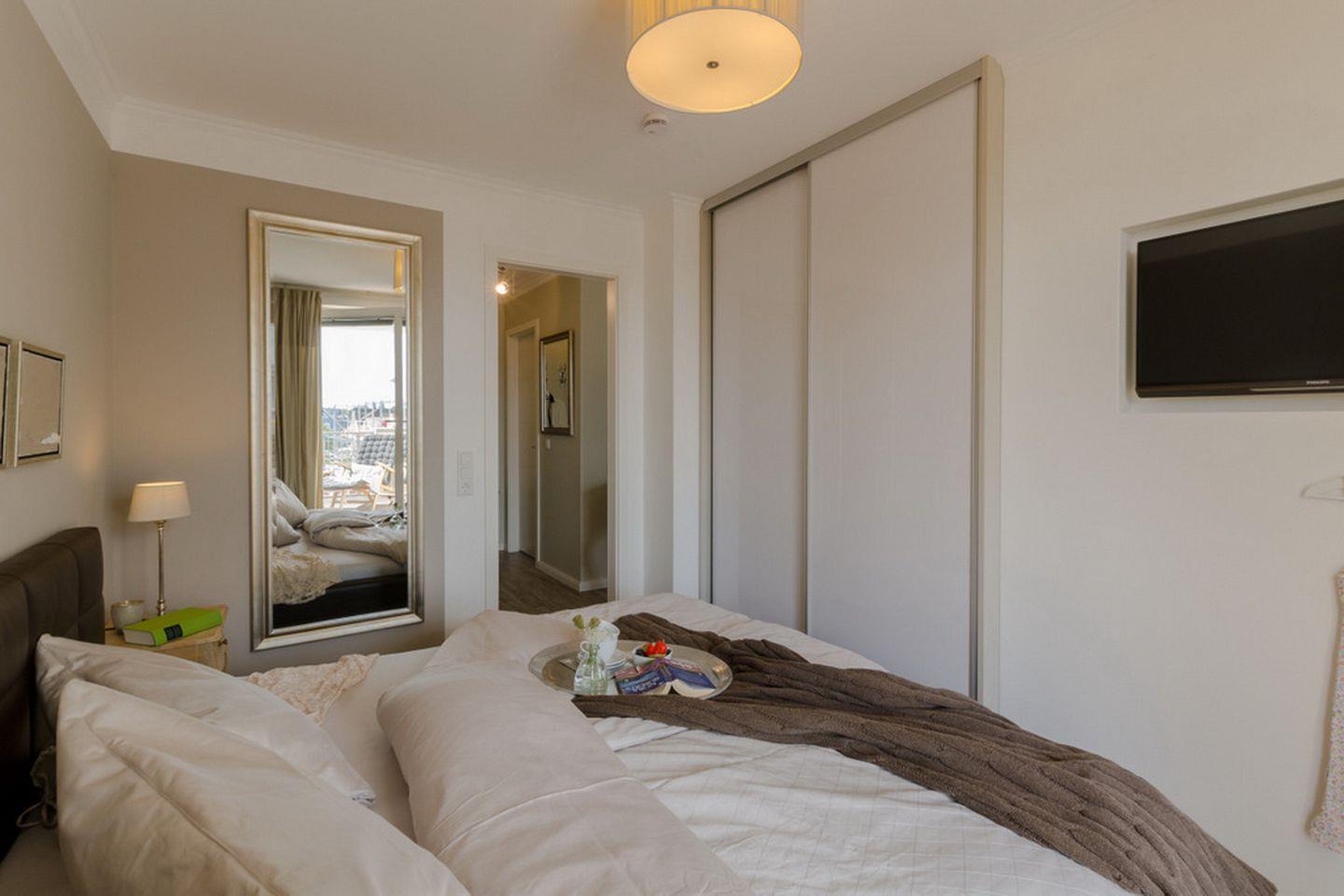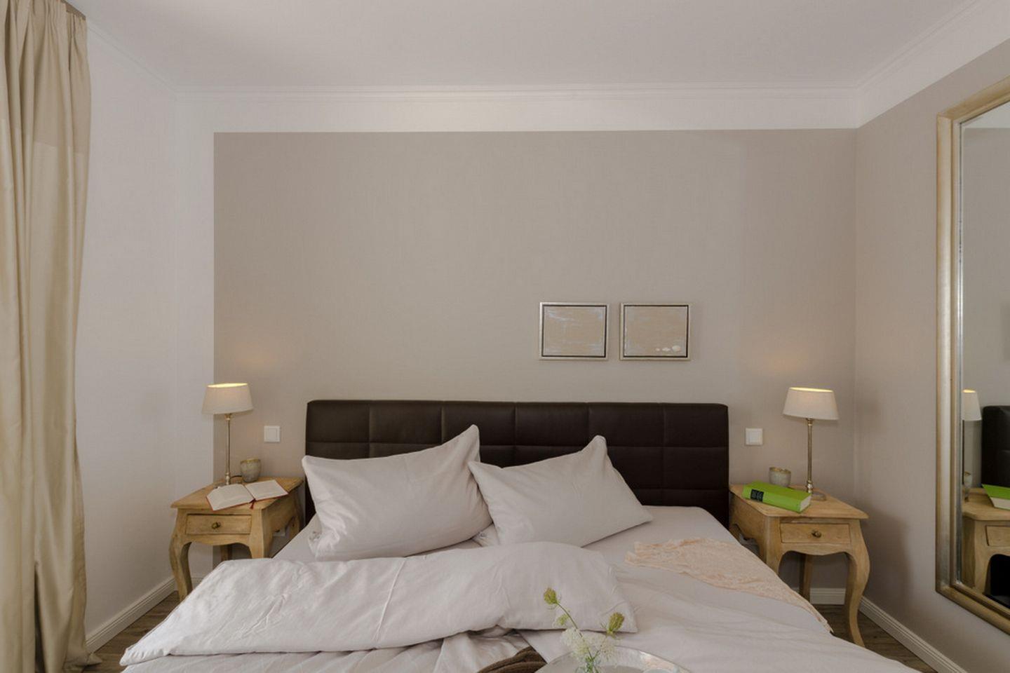 Im Schlafzimmer stehen ein Boxspringbett mit durchgehender Matratze (1 x 180 x 200 cm), zwei Nachtschränke, ein Einbauschrank sowie ein zweiter Flachbild-TV zur Verfügung. Ein großer Spiegel rundet das Gesamtbild ab.