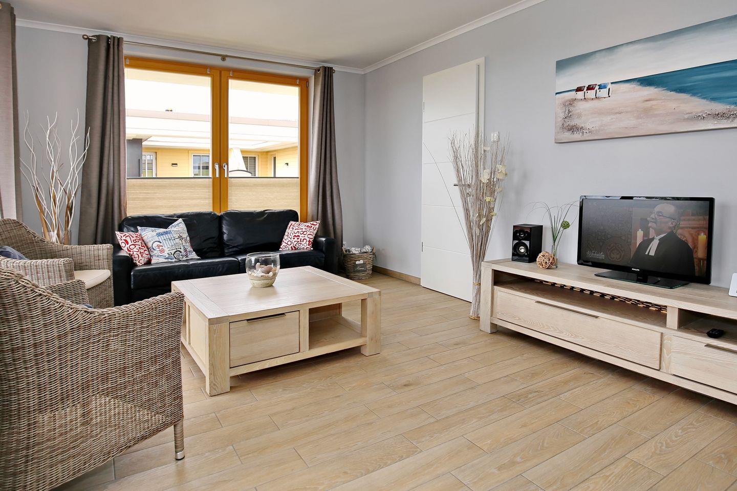 Im Wohnbereich steht Ihnen eine gemütliche Couch und 2 moderne Rattan Sessel zur Verfügung. Zur Ausstattung gehören selbstverständlich ein Radio, ein CD-Player, ein DVD-Player sowie ein Flachbild-TV und kostenloses WLAN.