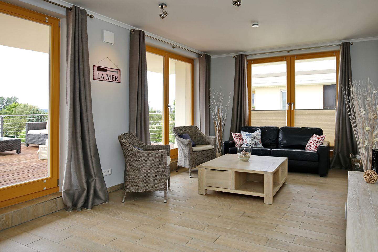 Die stilvoll und maritim eingerichtete 58 m² große 3-Zimmer Penthouse Ferienwohnung besticht mit einer großen Dachterrasse in Süd-West-Ausrichtung und einem Balkon mit Ost-Ausrichtung und Blick zum Meer, sodass Sie den ganzen Tag in der Sonne genießen können. Der gemütliche Wohnbereich lädt zu entspannten Stunden ein. Die moderne Küche mit direkt angrenzendem Essbereich verspricht allem Komfort, den man sich wünscht. Die großzügige Ferienwohnung liegt im Dachgeschoss der Villa Sanddorn und ist nur 50 Meter vom Ostseestrand entfernt.