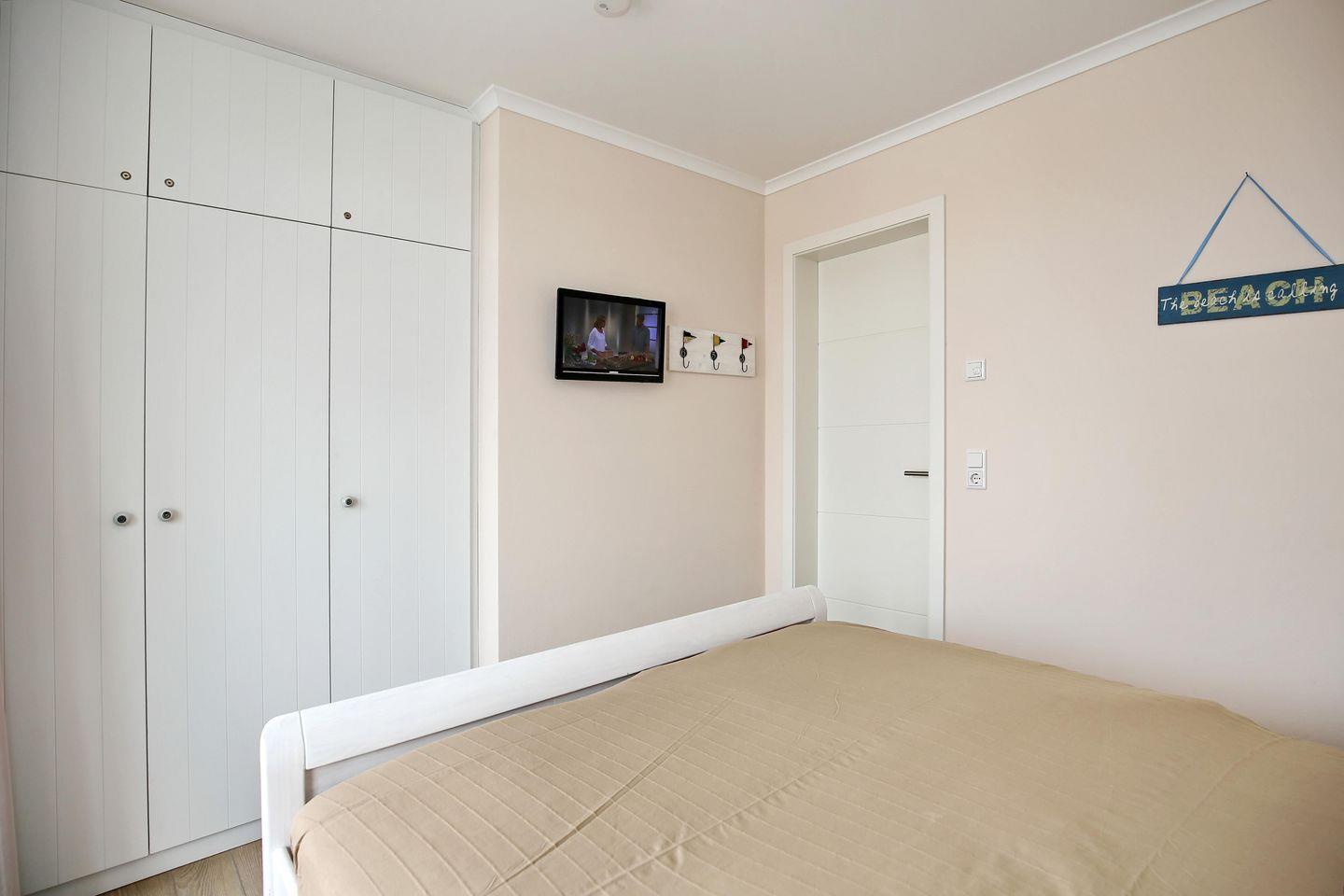 Das geschmackvoll eingerichtete Schlafzimmer in der Ferienwohnung verfügt über ein Doppelbett (2 x 90 x 200 cm) und einen großen Einbaukleiderschrank, in dem Sie Ihr Urlaubsgepäck verstauen können. Des Weiteren finden Sie auch hier einen Flachbild -TV vor. Vom Schlafzimmer aus gelangen Sie direkt auf den Ost-Balkon.