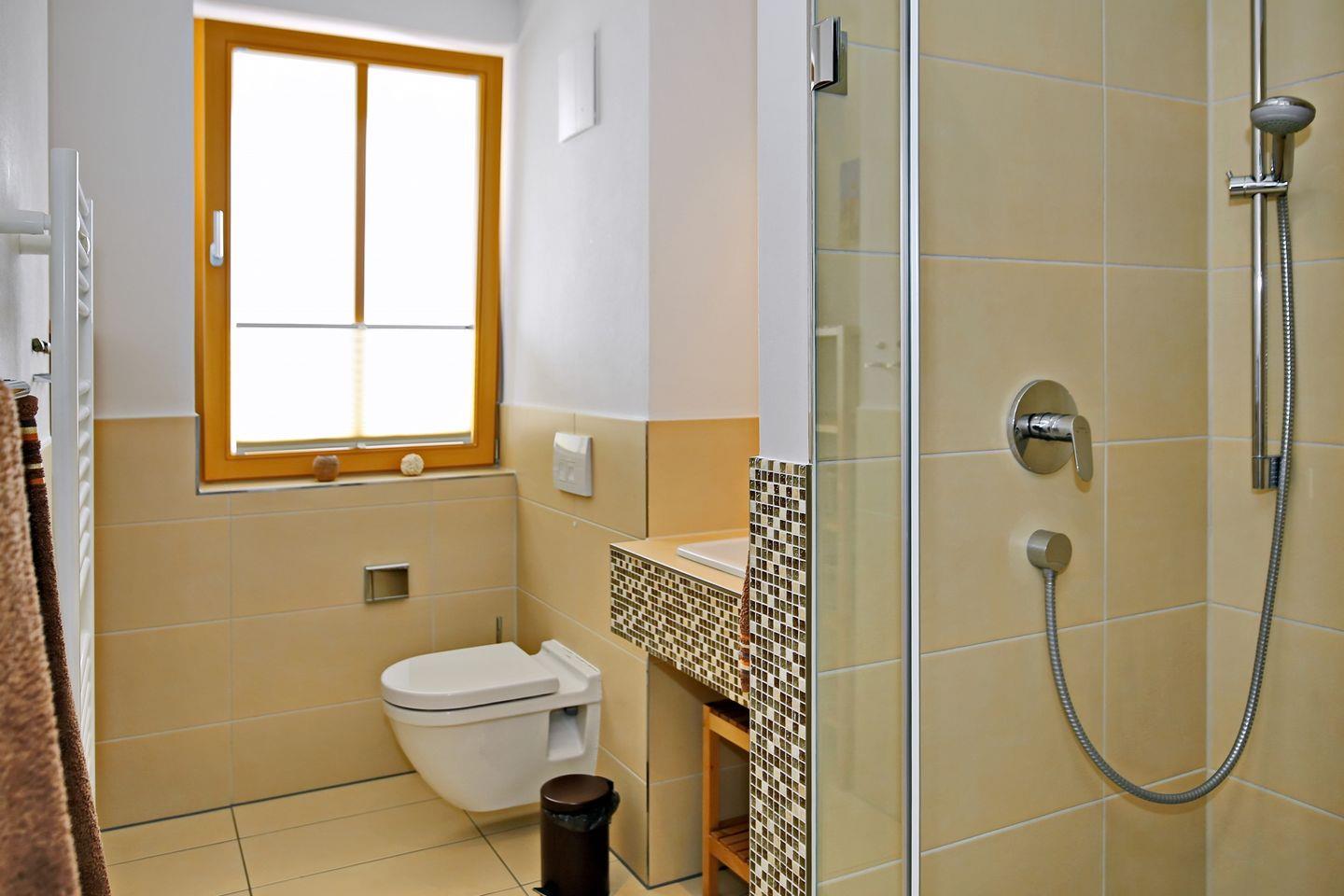 Die Ferienwohnung verfügt über ein modern gestaltetes ebenerdiges Duschbad. Ein großzügiger Waschtisch, ein Haartrockner und ein Kosmetikspiegel komplettieren die Ausstattung des Bades. In der gesamten Wohnung sind Bodenfliesen verlegt. In dieser Nichtraucherwohnung sind Haustiere nicht erlaubt.