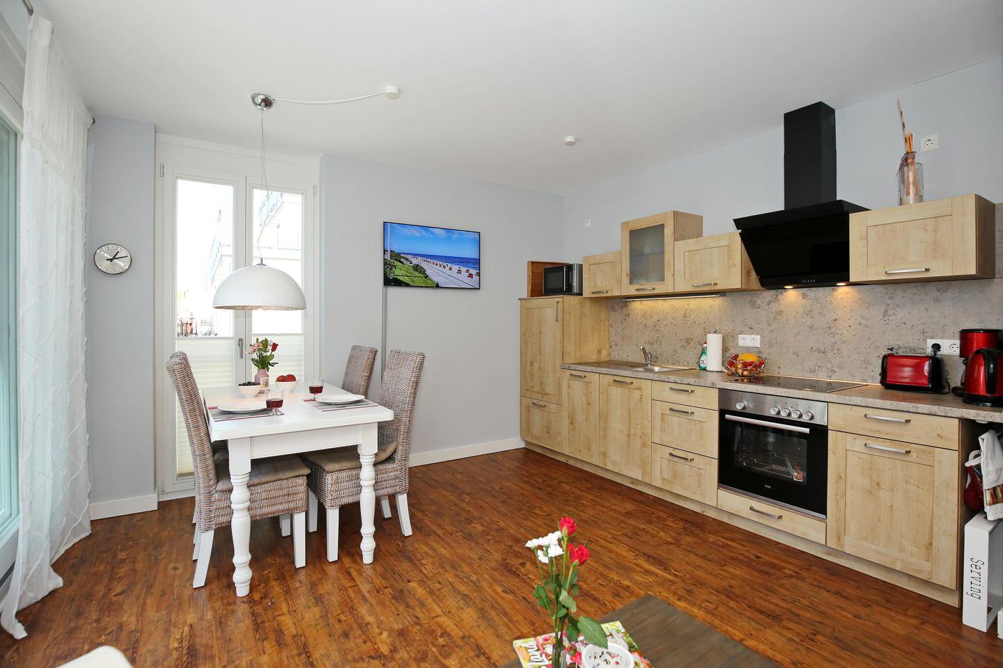 Die zum Essbereich direkt angrenzende, offene Küche bietet Ihnen alles, was das Herz begehrt. Diese ist für Sie mit einem Kühlschrank, einem Geschirrspüler, einer Mikrowelle sowie einem 4-Platten-Ceran-Kochfeld mit Backofen ausgestattet. Vervollständigt wird die Kücheneinrichtung durch einen Toaster, einen Wasserkocher und eine Filterkaffeemaschine.