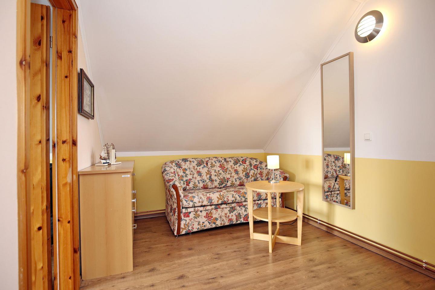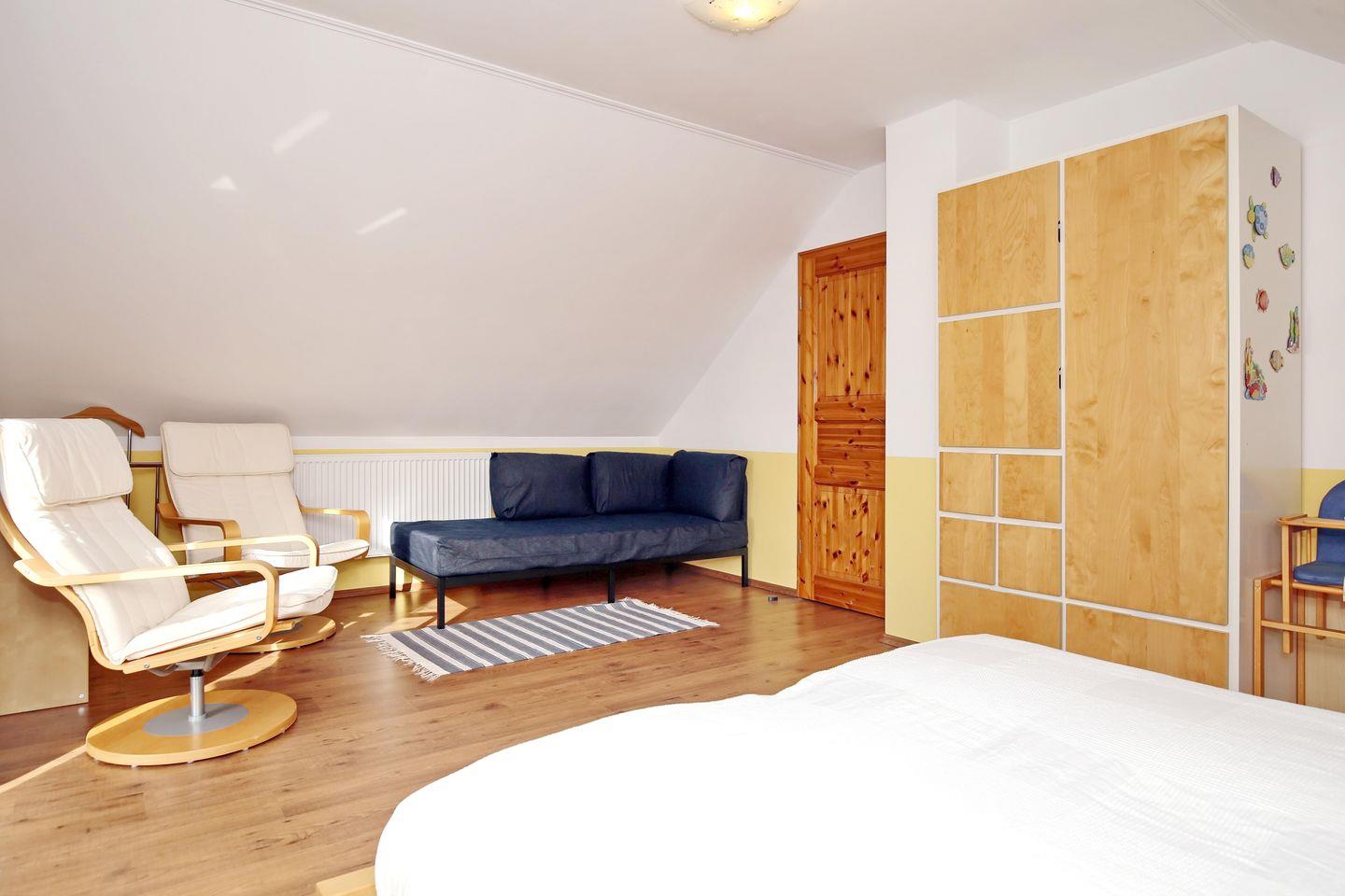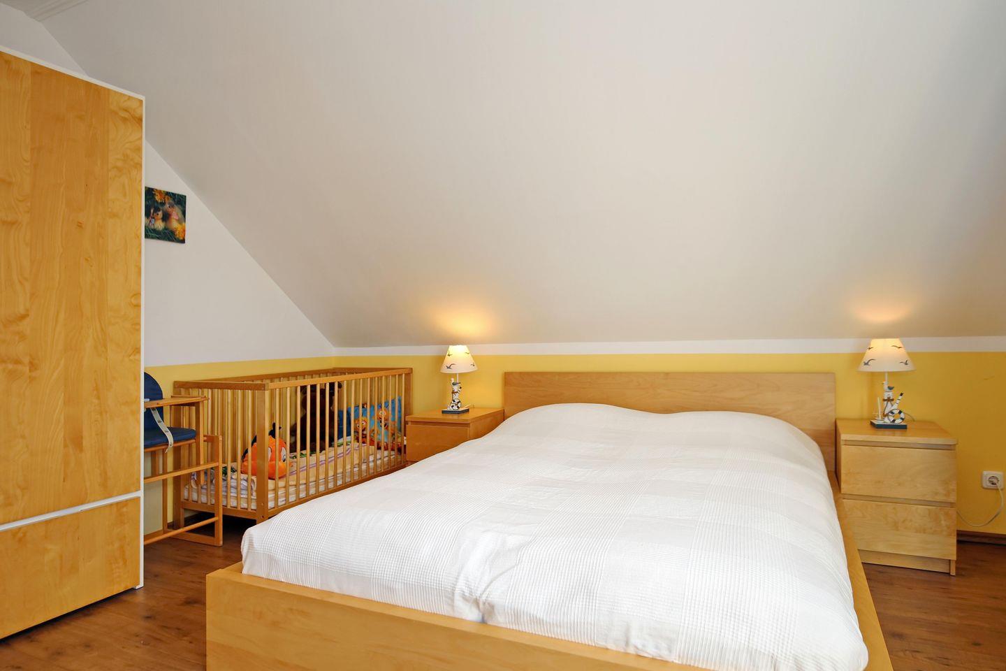 Im Erdgeschoss befindet sich auch ein Schlafzimmer. Das erste Schlafzimmer ist mit einem komfortablen Doppelbett (2 x 80 x 200 cm) eingerichtet. Ein Kleiderschrank dient als Stauraum für deine Kleidung. Das zweite Schlafzimmer erreichst du über eine Treppe im Obergeschoss des Hauses. Hier erwartet dich ebenfalls ein Doppelbett (2 x 80 x 200 cm) und ein Einzelbett (90x180 cm) zur Nachtruhe. Zur Unterhaltung steht ein TV zur Verfügung. Für dein Urlaubsgepäck ist auch hier eine Kommode vorhanden. Rollos dienen als Sichtschutz. Für die Kleinen sind ein Kinderhochstuhl und ein Kinderbettchen vorhanden. Ein Gäste-WC mit Waschbecken und Spiegel und ein weiterer Bereich mit einer Kommode und einem gemütlichen Schlafsofa (120x190 cm) befinden sich auch im Obergeschoss!
