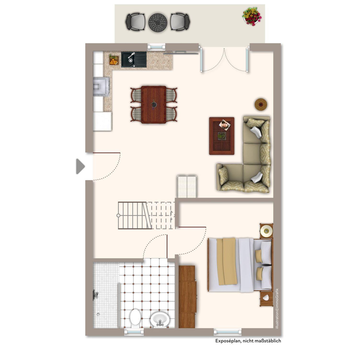 Zum Tageslichtbad im Erdgeschoss mit Dusche und WC gehören ein Waschtisch mit beleuchtetem Spiegel, ein Kosmetikspiegel sowie ein Föhn. Im gesamten Erdgeschoss sind Bodenfliesen mit Fußbodenheizung verlegt. Die Schlafräume im Obergeschoss sind mit einem Laminatfußboden ausgestattet. In dieser Nichtraucherwohnung sind Haustiere erlaubt.