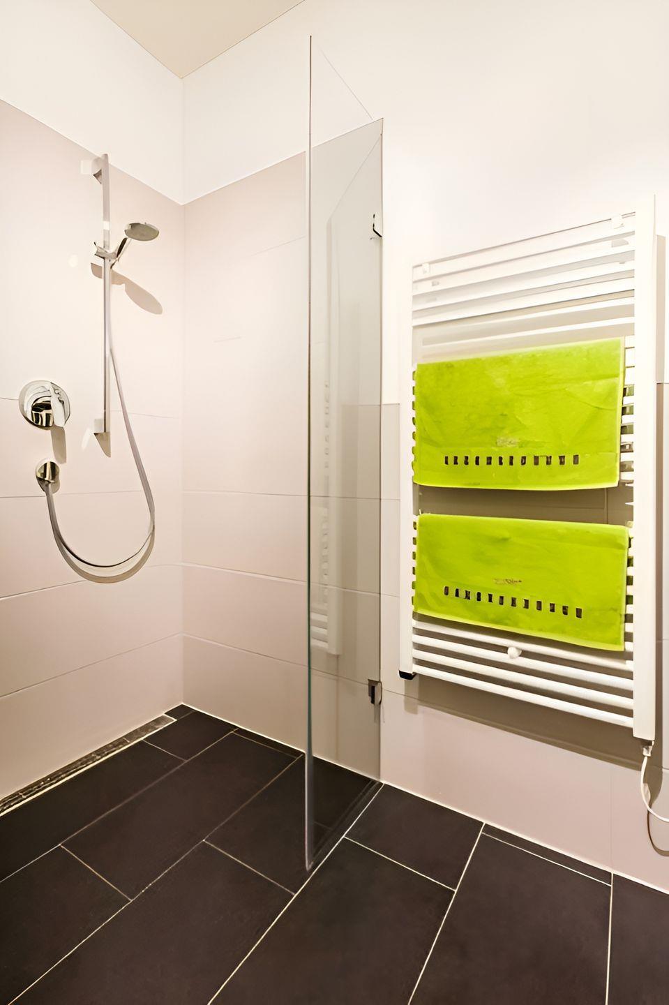 Das helle Badezimmer besticht mit einer ebenerdigen, großen Dusche mit