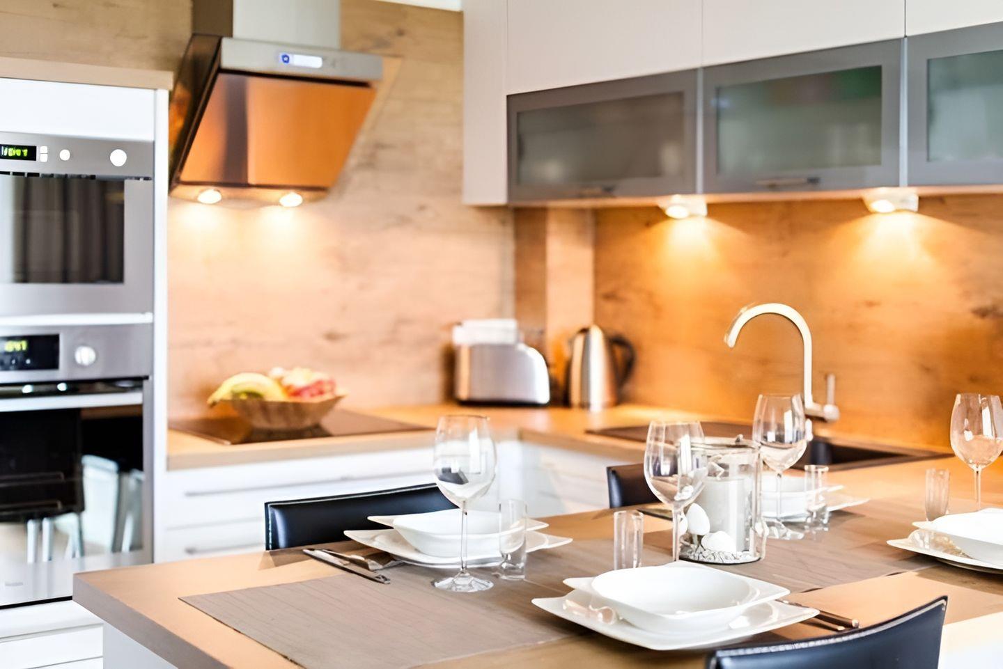 ausgestattete, moderne Einbauküche mit Cerankochfeld sowie Backofen, Mikrowelle,