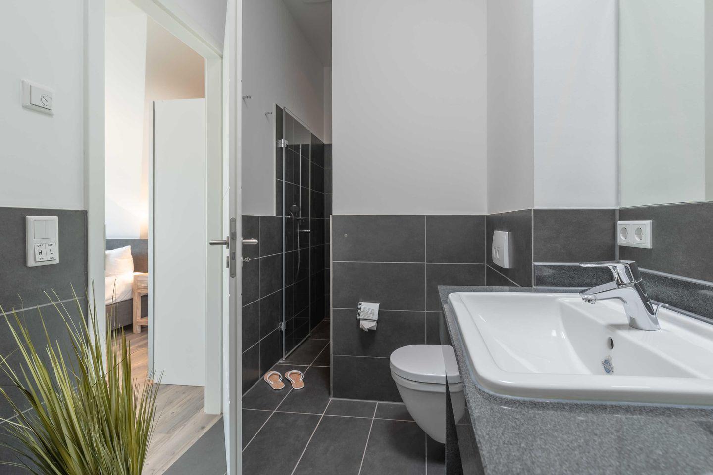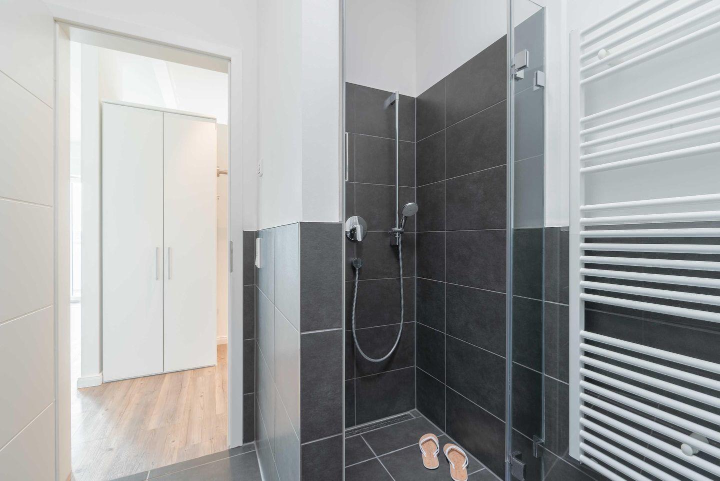 betreten. Beide Duschbäder haben eine bodengleiche Dusche und einen großen