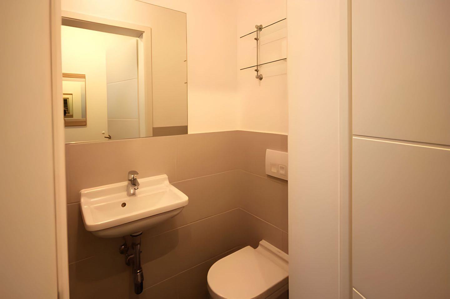 Waschtisch mit großem Spiegel und einen Fön. Zusätzlich hat die Wohnung ein
