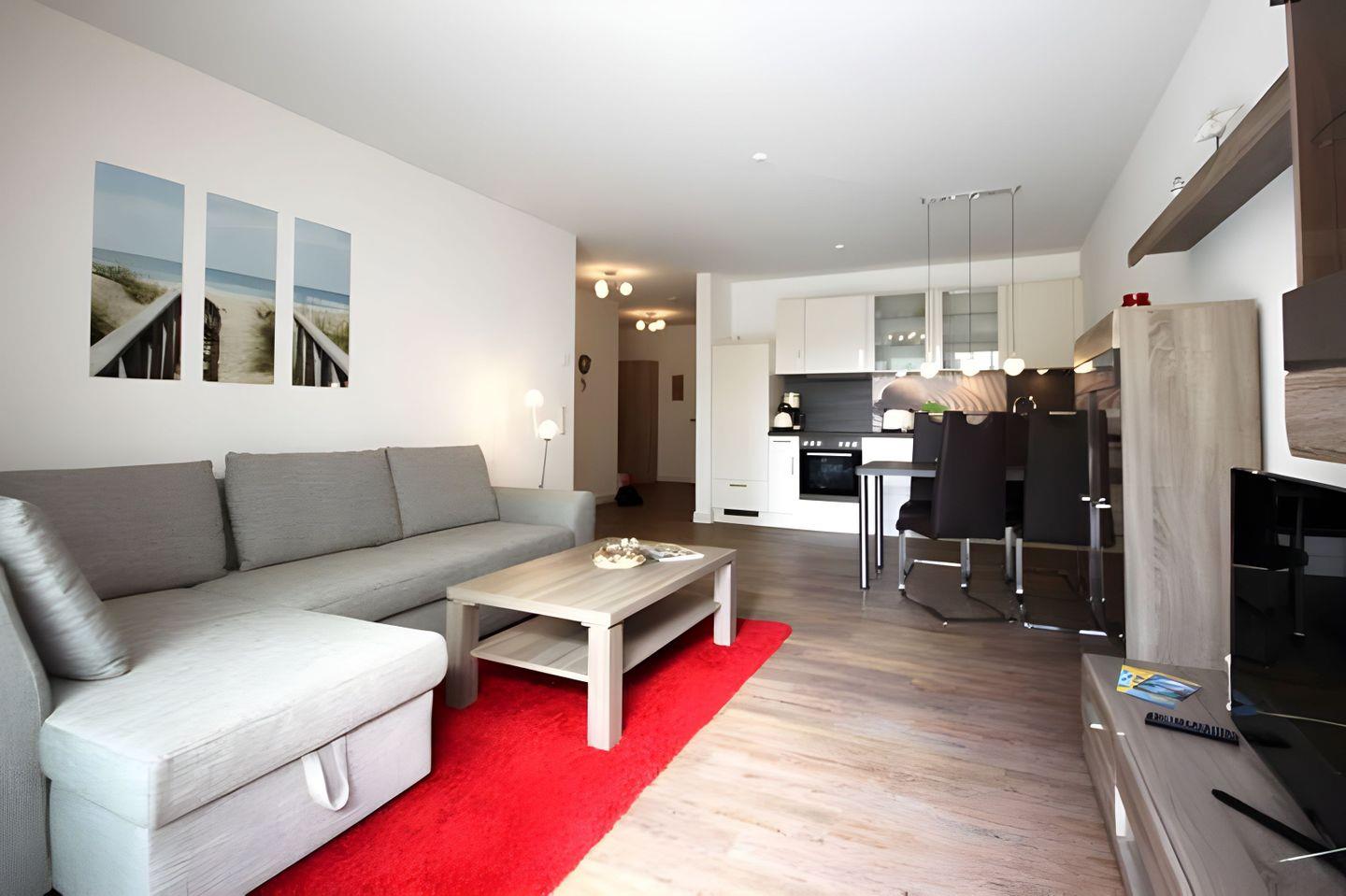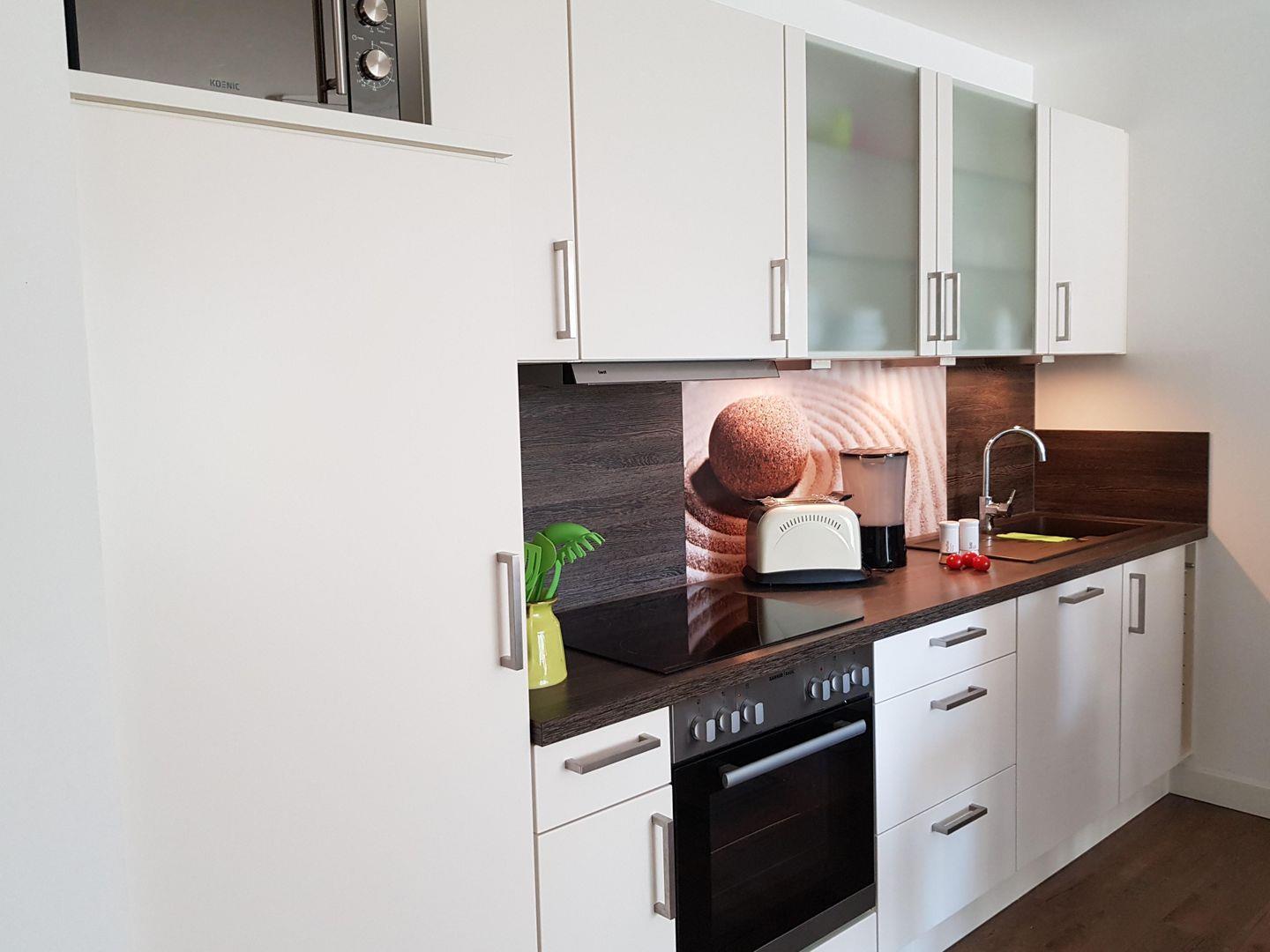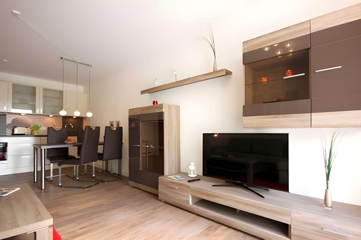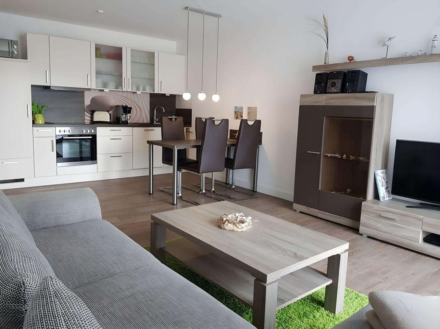 Im kombinierten ESS- UND WOHNRAUM befindet sich ein Tisch mit vier Stühlen. Ergänzt wird die Ausstattung im Wohnbereich mit einer Schlafcouch und einem TV- Gerät. Ein DVD-Player und Radio sind ebenfalls vorhanden. In der EINBAUKÜCHE finden Sie ein Cerankochfeld, Backofen, eine Mikrowelle, Geschirrspüler sowie Kühlschrank mit integriertem Gefrierfach.
