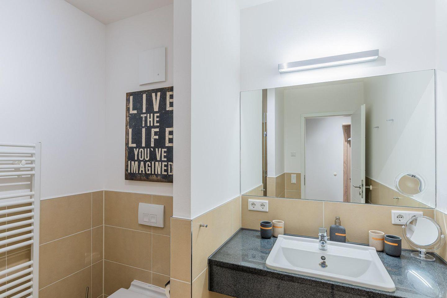 Diese moderne und gemütliche 2-Zimmerwohnung befindet sich in der Residenz Seestern. Im Wohnraum finden Sie eine hochwertige Couchgarnitur mit Schlaffunktion (1,40 x 2,00m) zum Relaxen. Zur Unterhaltung stehen Ihnen ein großer Flachbild TV, ein DVD-Player, eine Yamaha HiFi-Anlage mit Bluetooth, USB-Anschluss und CD zur Verfügung. Die voll ausgestattete Küche mit Induktionsherd, Geschirrspüler, Mikrowelle, Caffissimo - Tchibo Kaffeemaschine und weiteren Annehmlichkeiten wird Sie begeistern. Im modern eingerichteten Schlafzimmer finden Sie ein gemütliches Doppelbett (1,80 x 2,00m) mit einem geräumigen Schiebeschrank. Sowohl das Wohnzimmer als auch das Schlafzimmer haben einen direkten Zugang zur Terrasse. Das großzügige Bad mit Fußbodenheizung bietet eine bodengleiche Dusche und einen großen Waschtisch. Für Koffer und Taschen finden Sie eine separate Abstellkammer.