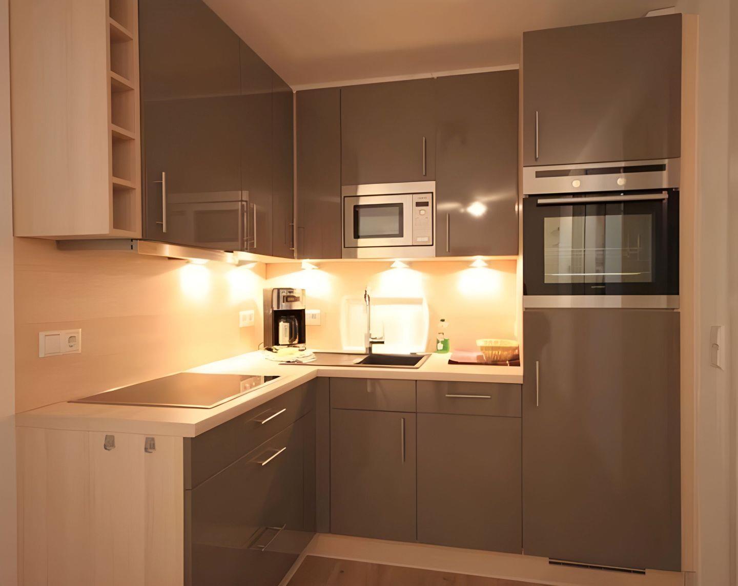 Auf der großen, L-förmigen Couch im WOHNBEREICH lässt es sich wunderbar relaxen. Oder ausgezogen, als Bett nutzen. Ein TV-Gerät, ein Blu-ray-Player sowie eine kleine Stereoanlage stehen für Unterhaltung zur Verfügung. Im offenen KOCH- UND ESSBEREICH befinden sich eine komplett eingerichtete Küche mit schönem Holztisch und sechs Stühlen. Sie finden dort Mikrowelle, Backofen, Cerankochfeld, Geschirrspüler und Kühlschrank, inklusive Gefrierfach.