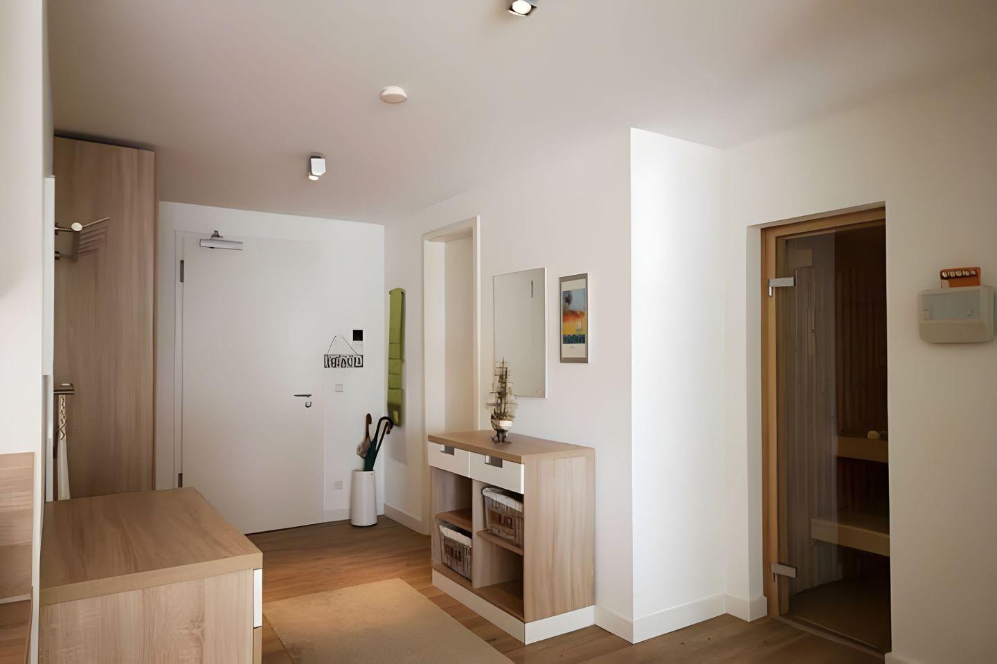 Die Villa Seeadler WE 08 in Börgerende bietet Komfort mit Balkon, Sauna und seitlichem Meerblick nur 200 m vom Strand entfernt.