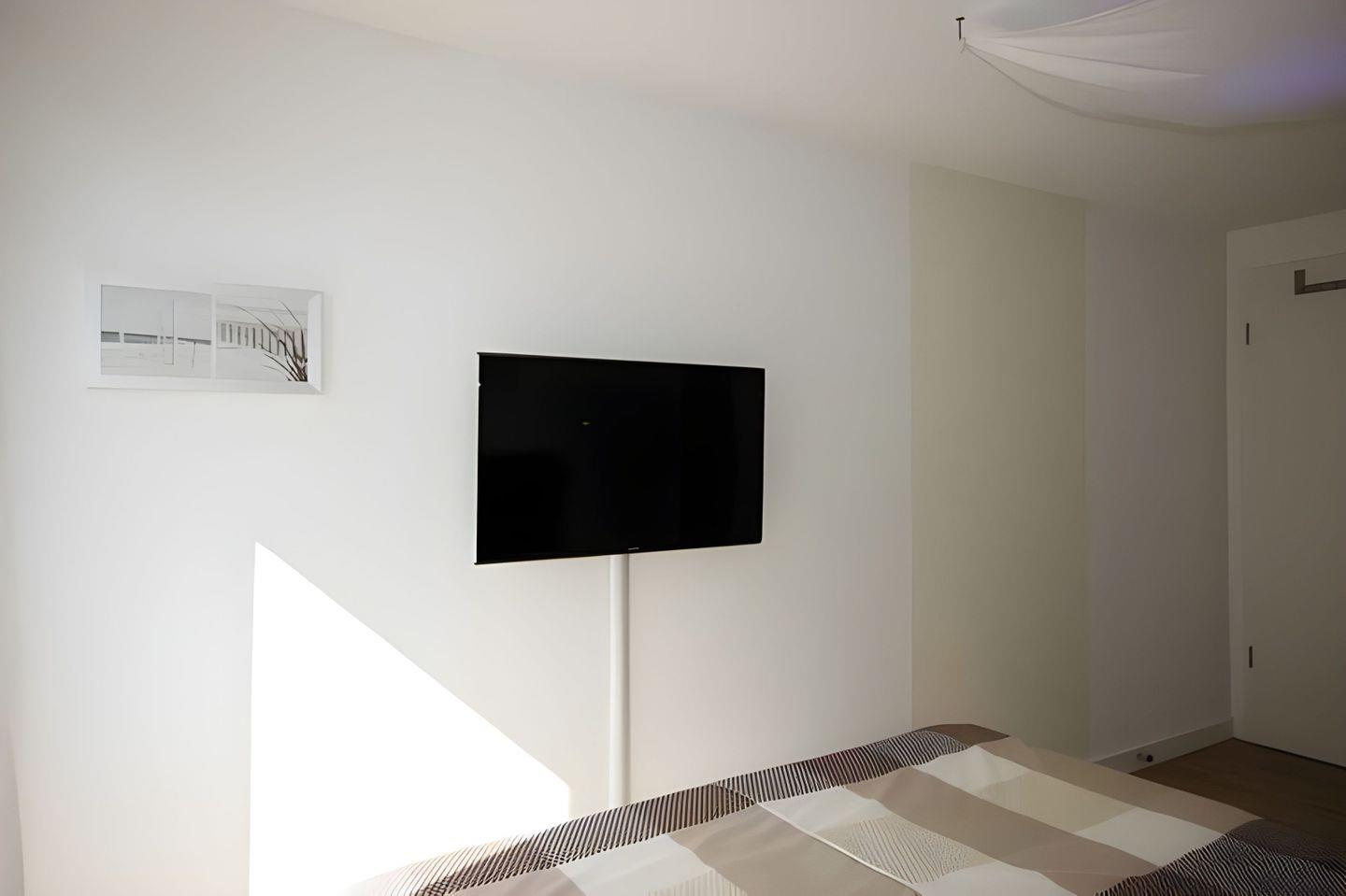In der EINBAUKÜCHE finden Sie Geschirrspüler, Kaffeemaschine, Wasserkocher, Toaster und Kühlschrank, inklusive Gefrierfach. Das SCHLAFZIMMER verfügt über ein Boxspringbett, ein TV-Gerät und natürlich einen Kleiderschrank. Auf dem BALKON, der nach Westen ausgerichtet ist, können Sie gemeinsame Mahlzeiten genießen oder vom Strandkorb aus, den Blick auf das Meer genießen. Der Zugang erfolgt direkt über den Wohnraum oder das Schlafzimmer. Das moderne BAD ist mit einer bodengleichen Dusche und einem Waschtisch mit großem Spiegel ausgestattet.