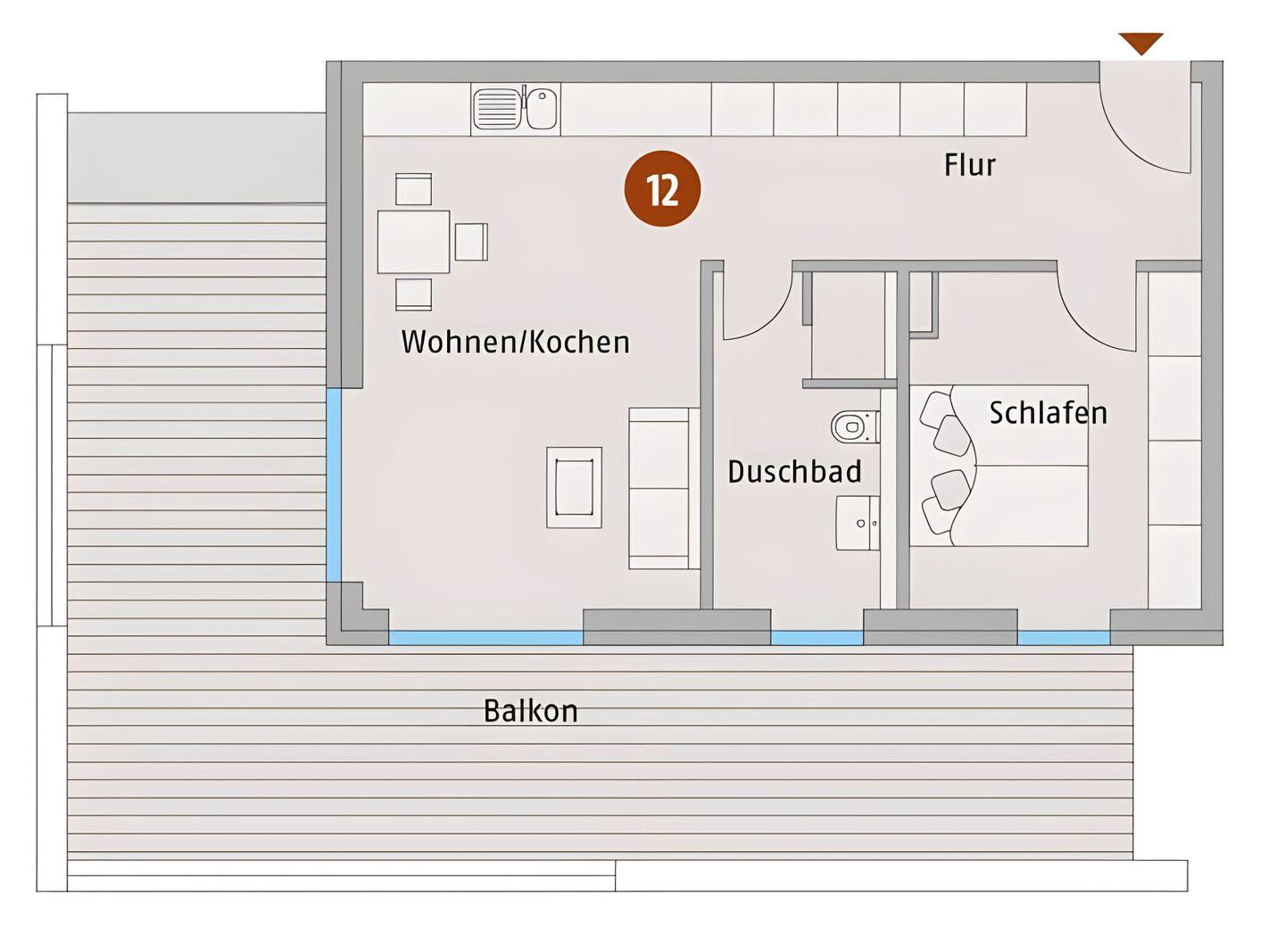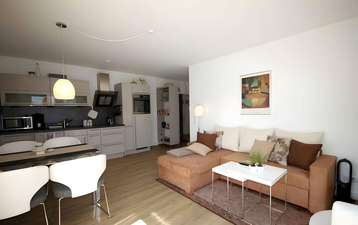 Diese Ferienwohnung besticht durch den großen ECKBALKON in Südwestausrichtung. Hier können Sie die Sonne vom Morgen bis in den späten Nachmittag genießen. Der WOHNBEREICH empfängt Sie mit einer L-förmigen Schlafcouch plus Sessel. Einen TV-Gerät inklusive Radio und DVD-Player sorgt für Unterhaltung. Der OFFENE KOCH- UND ESSBEREICH bietet Ihnen eine voll ausgestattete Einbauküche. Hier finden Sie eine Mikrowelle, einen Backofen, Cerankochfeld, Geschirrspüler und Kühlschrank, inklusive Gefrierfach. Toaster, eine Kaffeemaschine und Wasserkocher sind natürlich auch vorhanden. Am Esstisch, der sich bei Bedarf ausziehen lässt, stehen vier Stühle bereit.