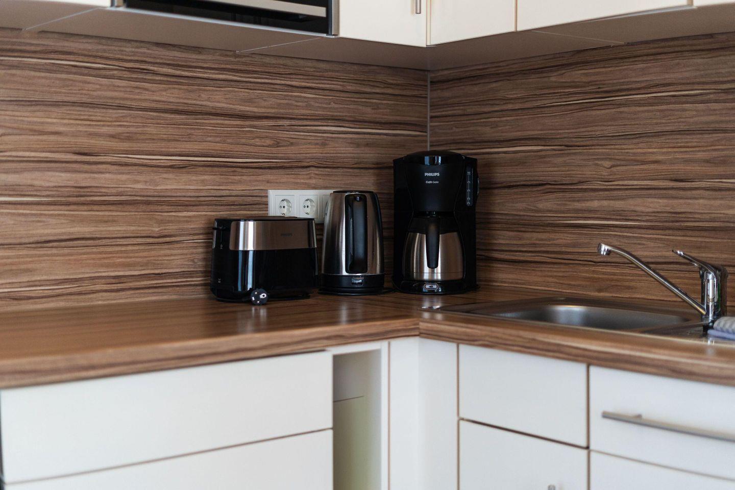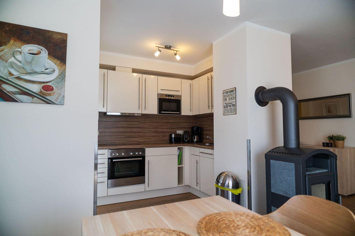 Die im Wohnbereich integrierte EINBAUKÜCHE ist voll ausgestattet mit Geschirrspüler, Kühlschrank (OHNE Gefrierfach), Filterkaffeemaschine, Wasserkocher, Toaster und Mikrowelle.