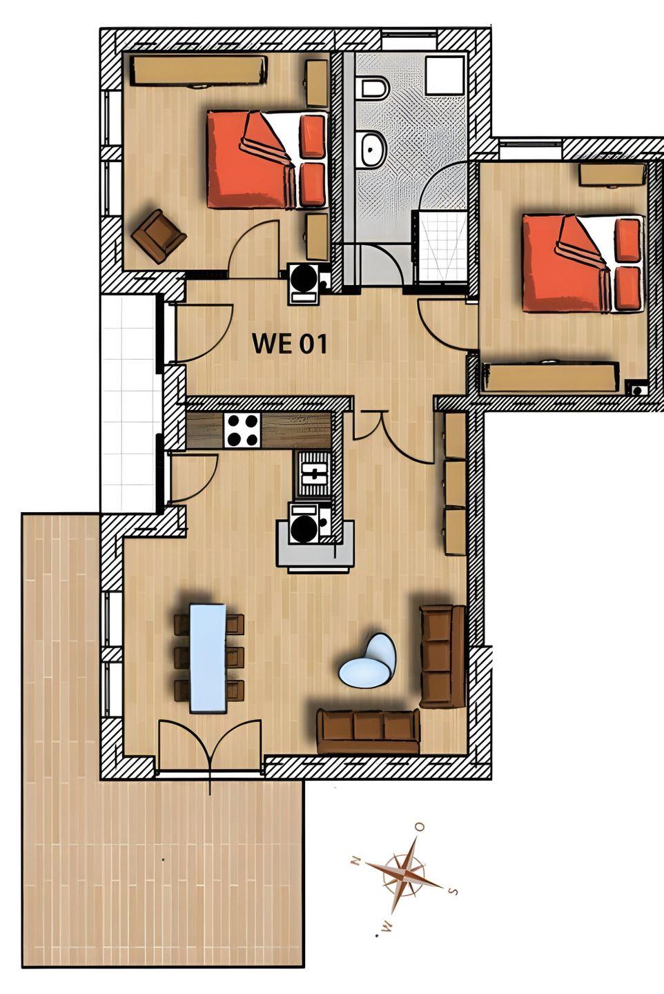 Die Parkresidenz WE 01 in Börgerende bietet auf ca. 71 m² ein komfortables Ambiente mit offener Küche (ohne Gefrierfachmöglichkeit), zwei Schlafzimmern und moderner Ausstattung. Zu den Vorzügen zählen eine Terrasse mit Gartenblick, kostenfreier Privatparkplatz sowie TV, Spülmaschine und WLAN. Strand und Stadtzentrum sind in wenigen Minuten erreichbar.
