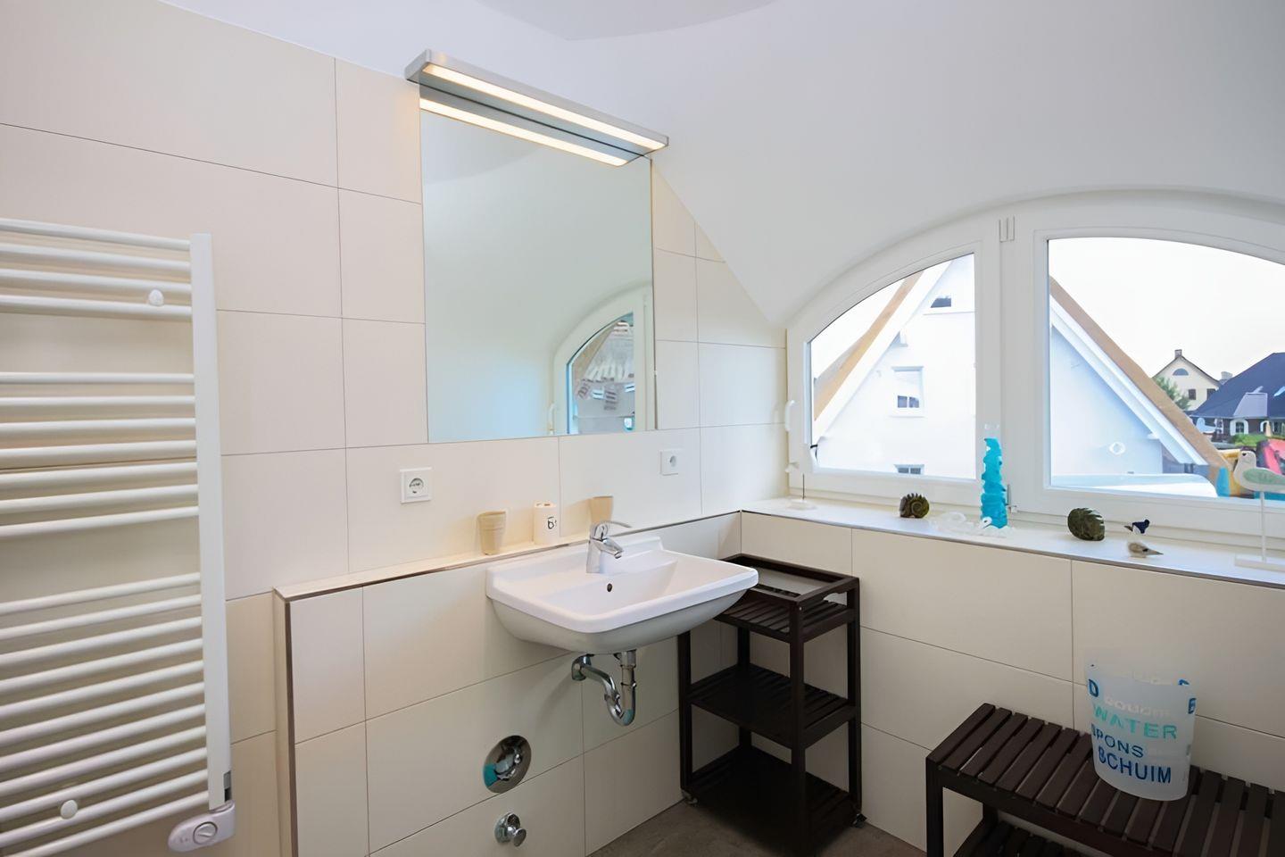 Im Obergeschoss befindet sich das zweite großzügig und hell angelegte Badezimmer