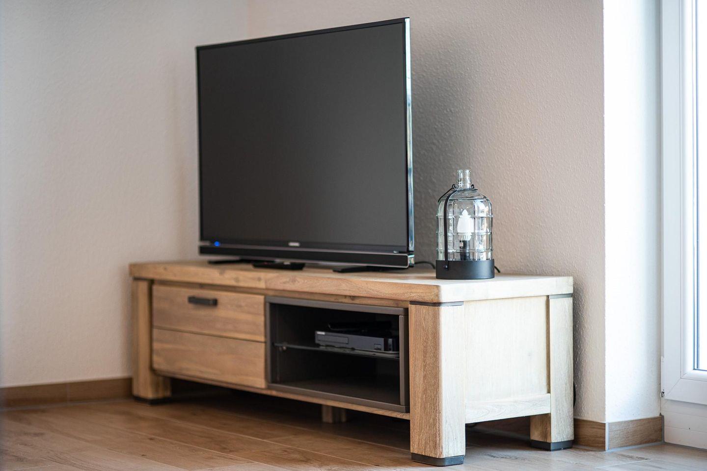 Der offener Wohn- und Essbereich mit LED-TV, Bluray Player und Holzkamin lädt