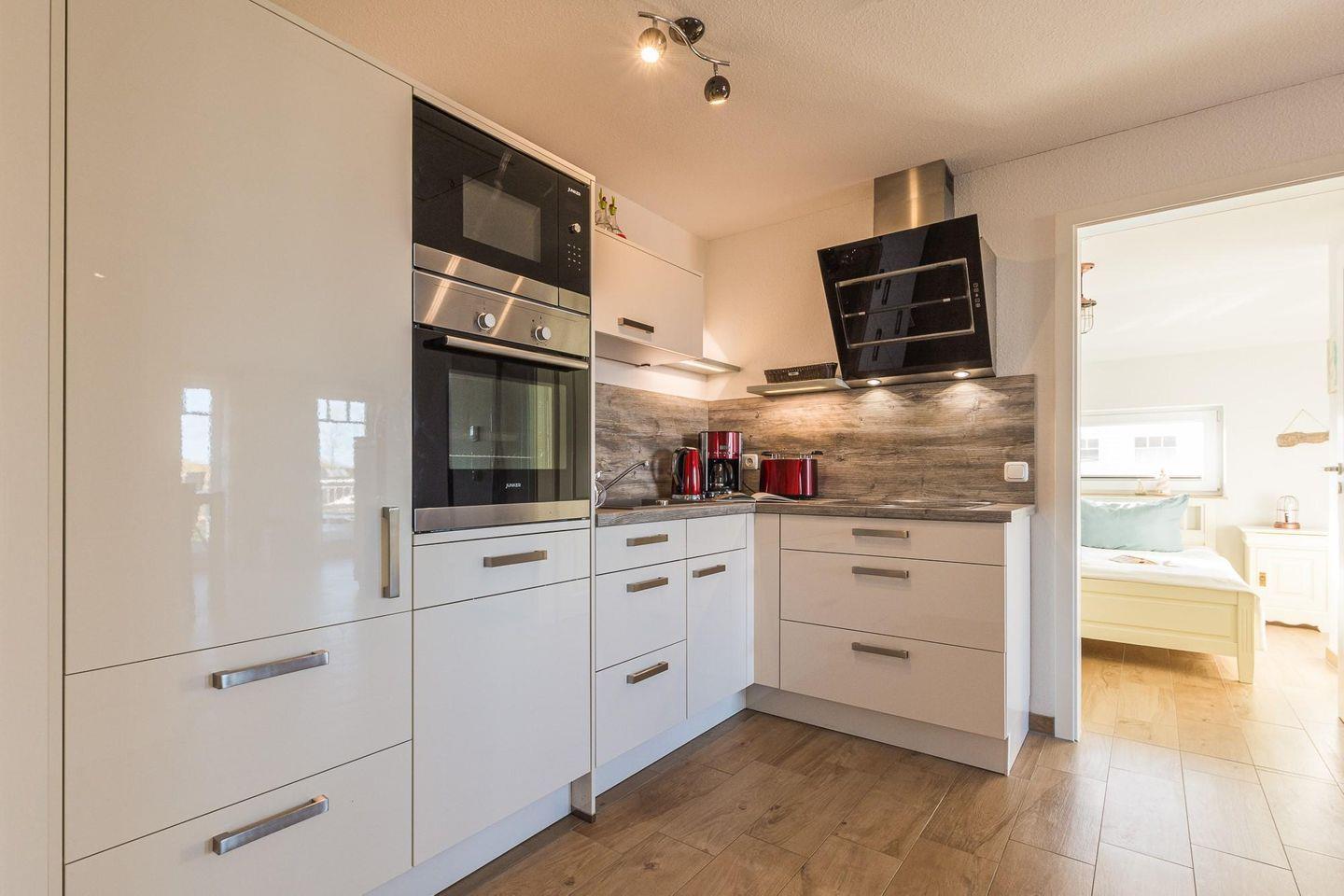 ist komplett eingerichtet mit Spülmaschine, Backofen, Mikrowelle und