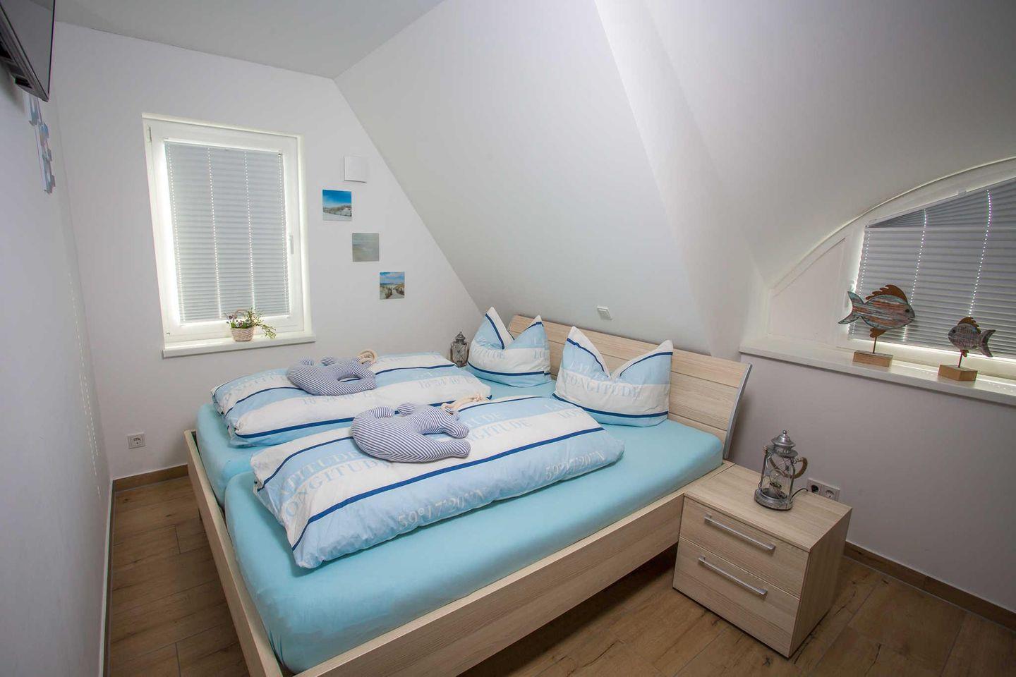 Beide Schlafzimmer sind mit geräumigen Kleiderschränken sowie Doppelbetten (1,80 x 2,00 m) mit 7 Zonen Qualitätsmatratzen im Härtegrad ausgestattet. Hierbei erwarten Sie je ein Bett mit Härtegrad 2 (bis 80 kg) und ein Bett mit Härtegrad 3 (über 80 kg). Zum besseren Einschlafen hilft im größeren Schlafzimmer ein wandhängendes 40-Zoll-Flat-TV-Gerät.