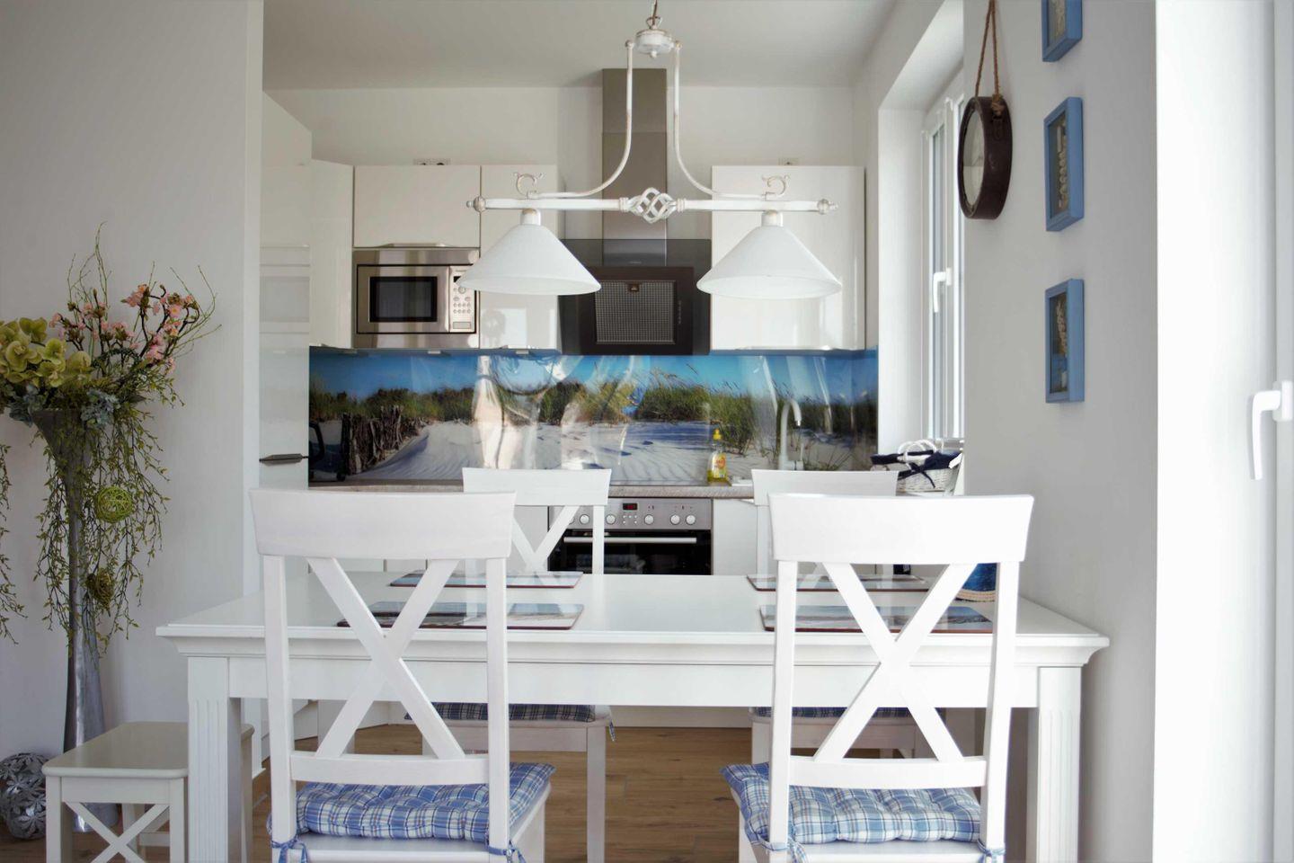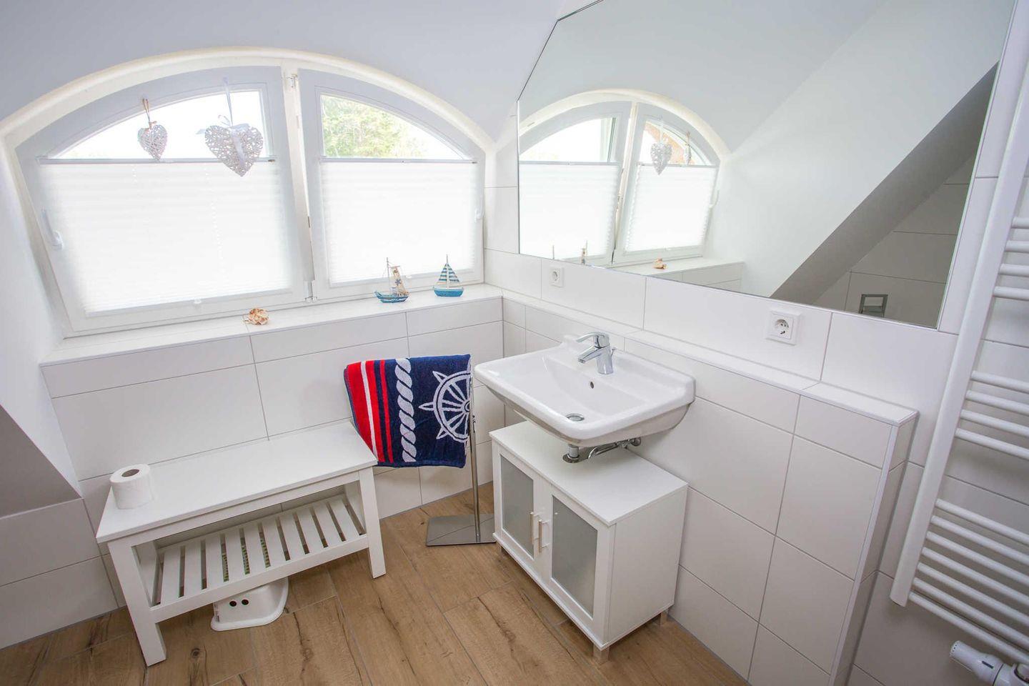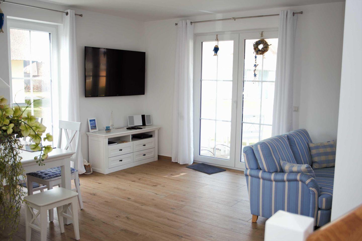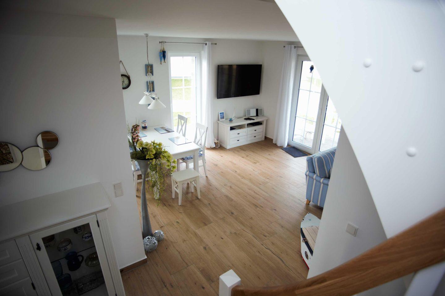 Im Erdgeschoss befindet sich der großzügig gestaltete Wohnbereich mit integrierter Küche und ein Duschbad. Der maritim eingerichtete Wohnbereich eignet sich ideal zum Entspannen nach einem ausgedehnten Strandspaziergang. Die modernen Elektronikgeräte wie wandhängender ein 60-Zoll-Flat-TV, ein Blu-ray-Player, ein DAB-Radio oder ein Spieleabend mit der Familie lassen die Zeit spaßig verfliegen. Die moderne Einbauküche sowie diverse Küchengeräte wie Geschirrspüler, Toaster, Kaffeemaschine, Wasserkocher, Mikrowelle, Herd mit Cerankochfeld, Backofen und Kühl-Gefrierkombination bieten ambitionierten Hobbyköchen auch im Urlaub die Möglichkeit Essen nach eigenen Wünschen zu kochen. Die Küche ist großzügig mit Ess- und Kochgeschirr, Besteck und Gläsern ausgestattet. Im hell gefliesten Duschbad mit Glasdusche, großem Waschtisch mit Unterschrank, darüber ein Wandspiegel, der in die Fliesenstruktur integriert wurde, einem WC, Föhn und Handtuchtrockner macht Körperhygiene Freude.