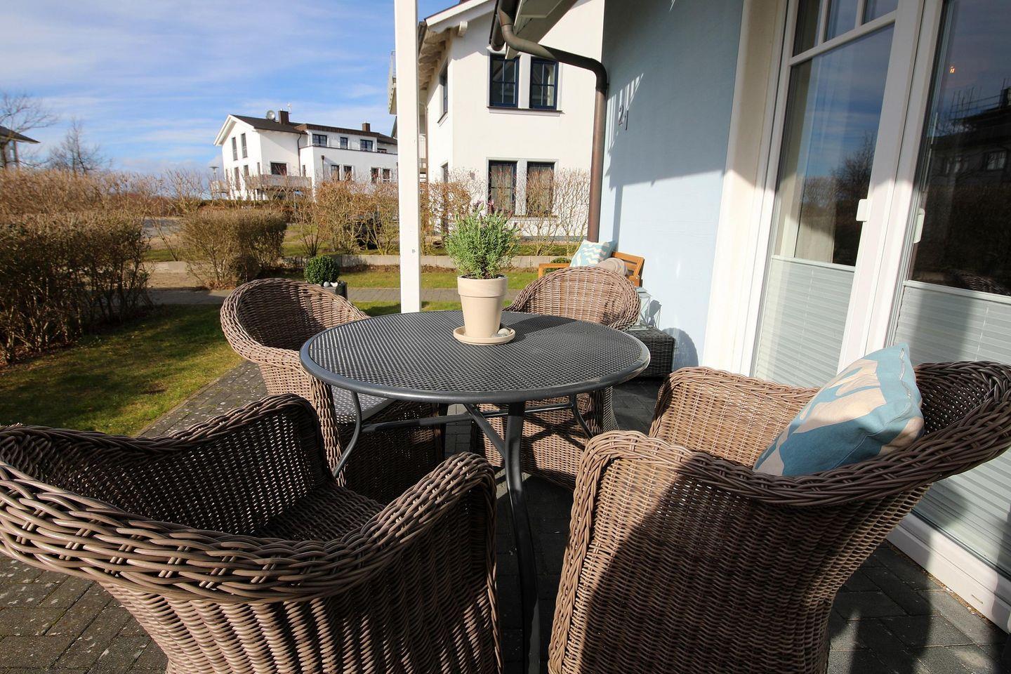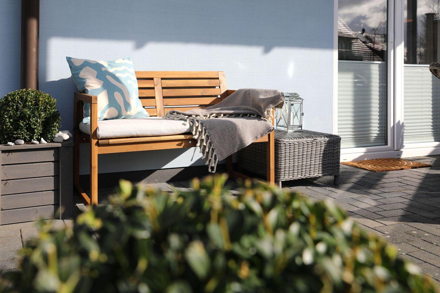 Auf die sonnige TERRASSE gelangen Sie direkt über den Wohnbereich. Gartenmöbel für ein entspanntes Frühstück oder Abendessen stehen für Sie bereit.