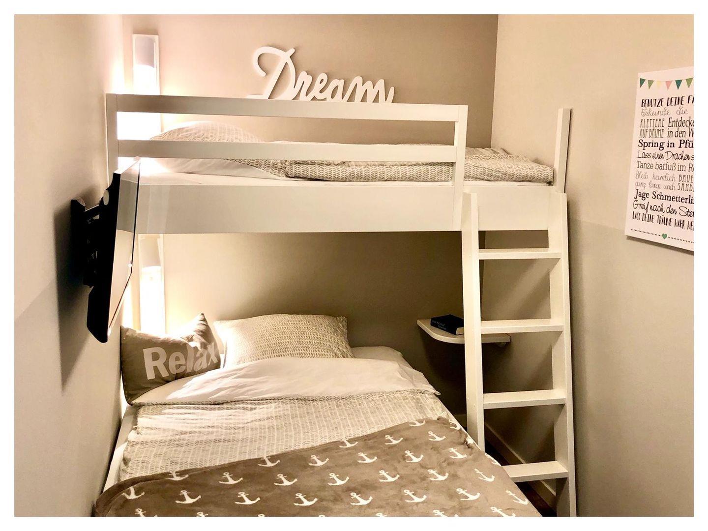 • Schlafzimmer 2: Boxspringbett (140?×?200?cm) + Hochbett (190?×?80?cm, abnehmbare Leiter), Smart-TV