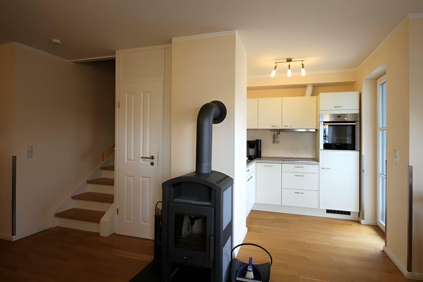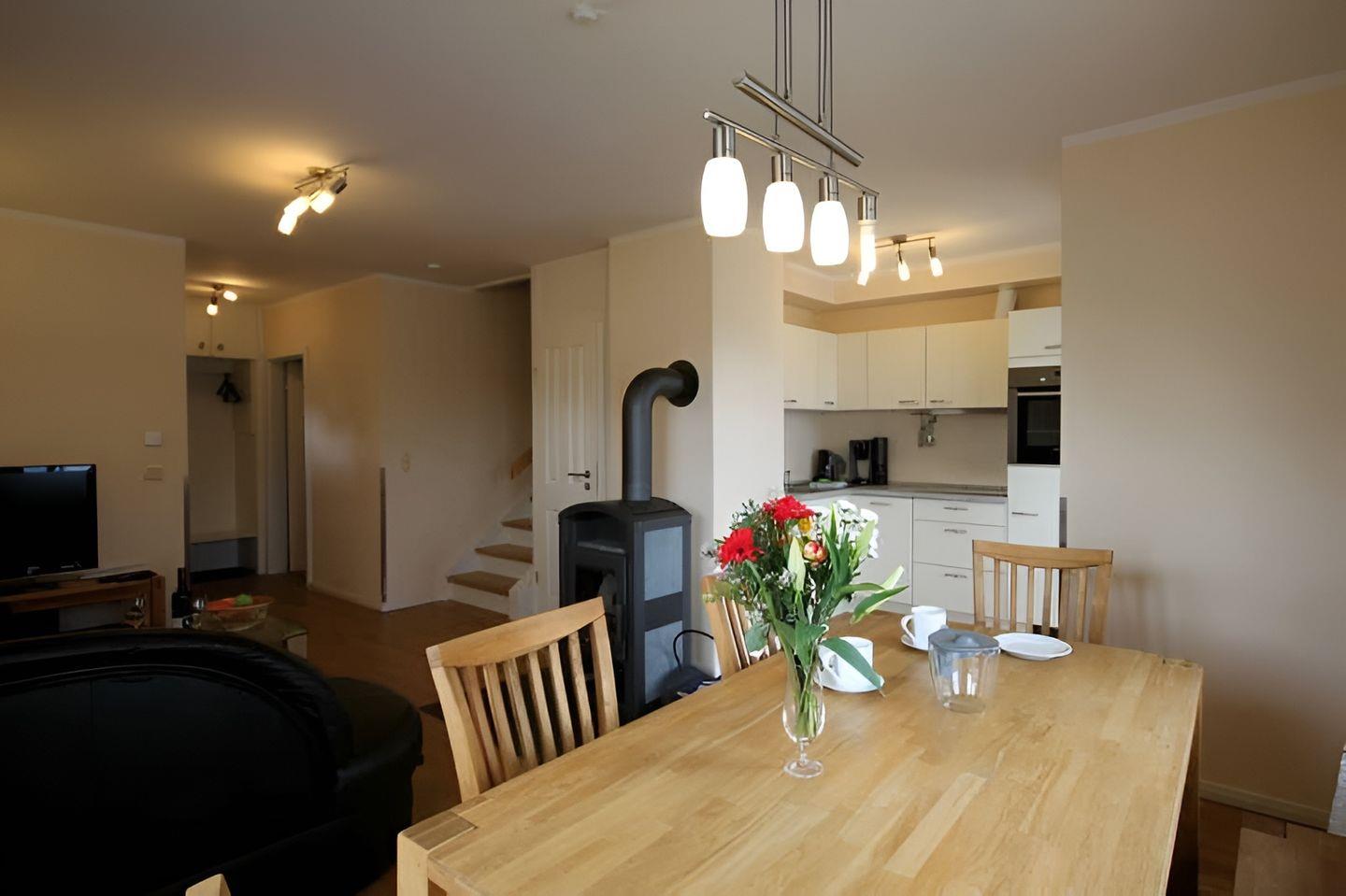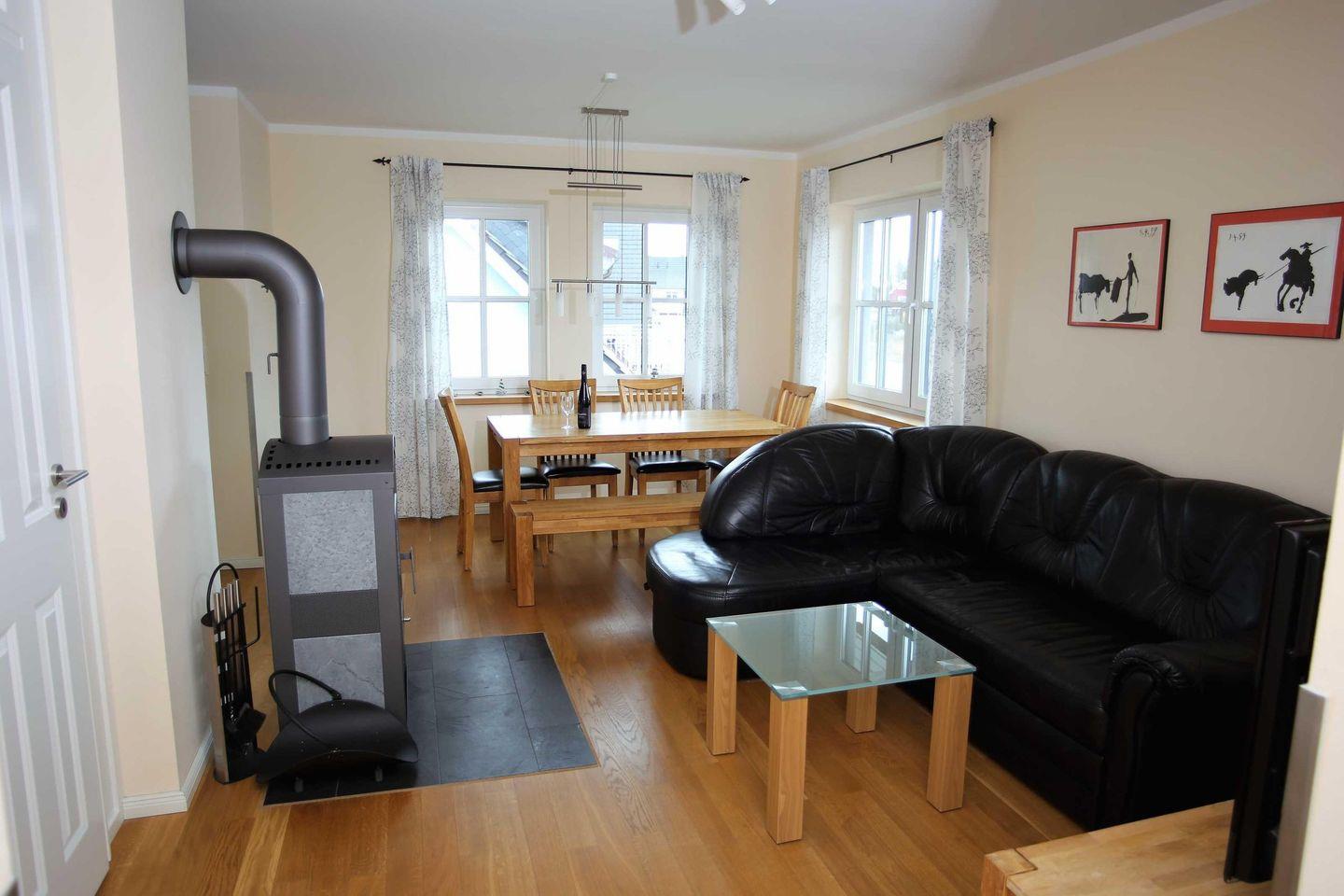 Das offene Wohn-/ Esszimmer empfängt Sie mit einem rustikalem Kaminofen (Brennholz muss selbst organisiert werden), einer ausziehbarer Eck-Couch und einem großen Esstisch mit Stühlen und Sitzbank. Ein Flatscreen-TV und ein Musikradio gehören zum technischen Zubehör des Raums. Die Einbauküche ist voll ausgestattet mit Geschirrspüler, Kühl-/Gefrierkombi, Ceranfeld, Backofen, Kaffeemaschine, Wasserkocher und Toaster. Das Bad besticht mit einer ebenerdigen Dusche. Ein kleiner separater Abstellraum bietet Platz für Ihre Koffer und andere Mitbringsel.