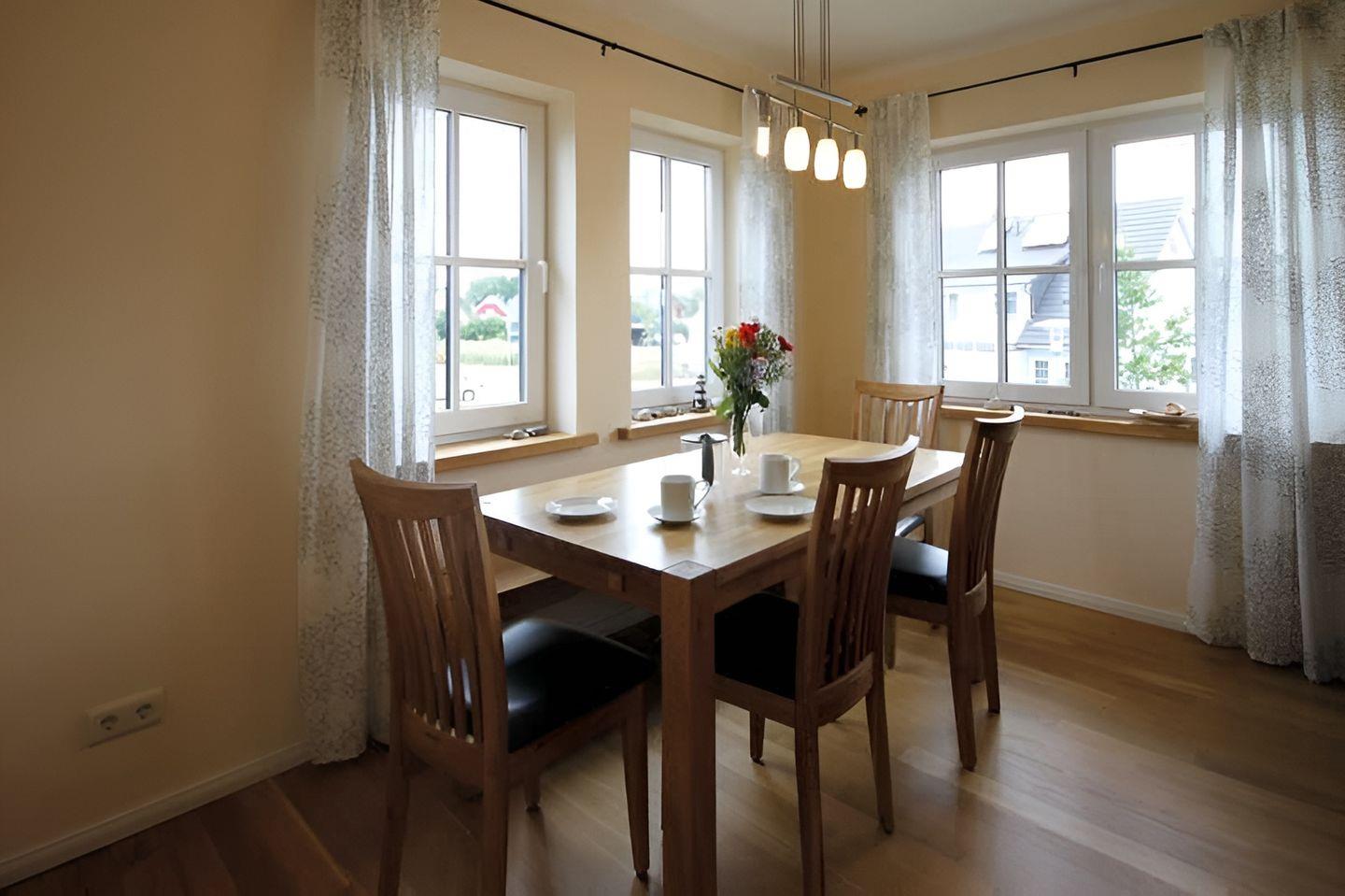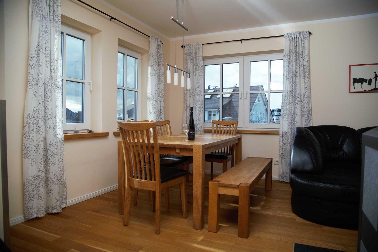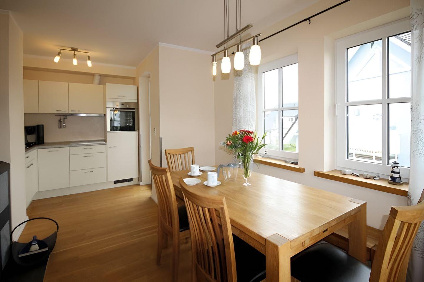Das offene Wohn-/ Esszimmer empfängt Sie mit einem rustikalem Kaminofen (Brennholz muss selbst organisiert werden), einer ausziehbarer Eck-Couch und einem großen Esstisch mit Stühlen und Sitzbank. Ein Flatscreen-TV und ein Musikradio gehören zum technischen Zubehör des Raums. Die Einbauküche ist voll ausgestattet mit Geschirrspüler, Kühl-/Gefrierkombi, Ceranfeld, Backofen, Kaffeemaschine, Wasserkocher und Toaster. Das Bad besticht mit einer ebenerdigen Dusche. Ein kleiner separater Abstellraum bietet Platz für Ihre Koffer und andere Mitbringsel.
