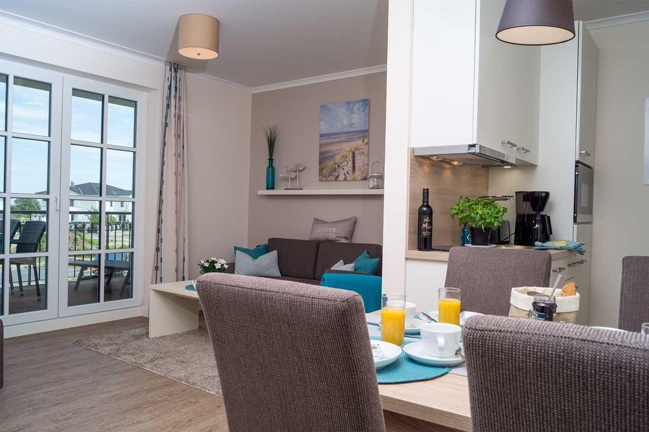 Vom Wohnraum haben Sie Zugang zum großzügigen Balkon mit Tisch und vier Stühlen