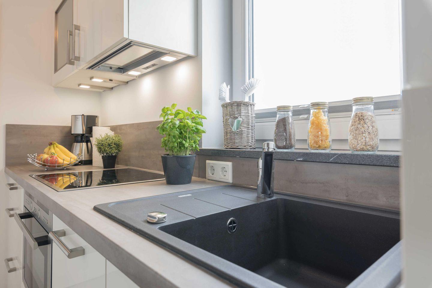 Gefrierfach, einen Backofen mit integrierter Mikrowelle, ein Cerankochfeld,