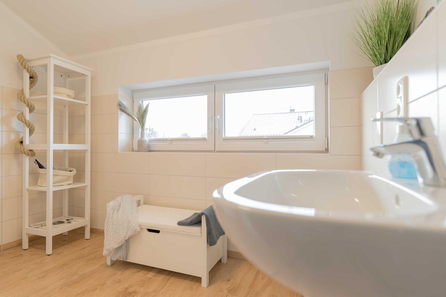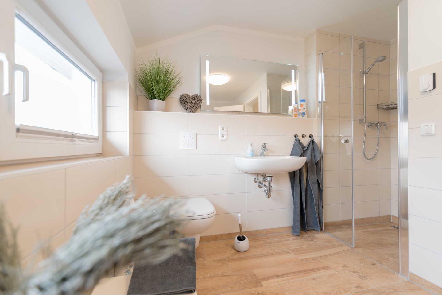 Das Badezimmer besticht mit bodengleicher Dusche, beleuchtetem Spiegel,