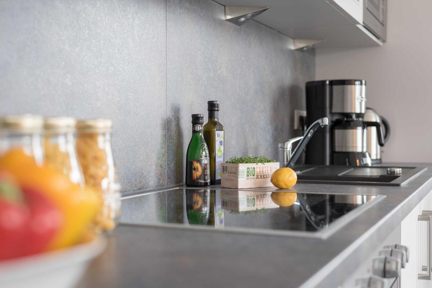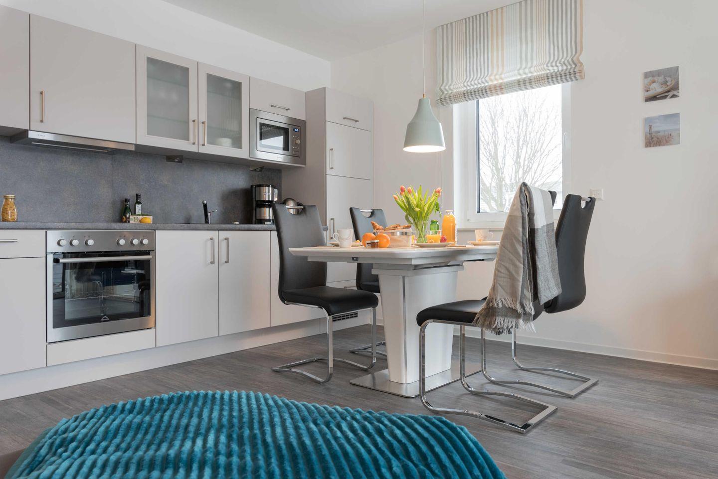 Backofen, einen Kühlschrank inklusive Gefrierfach, eine Mikrowelle, einen