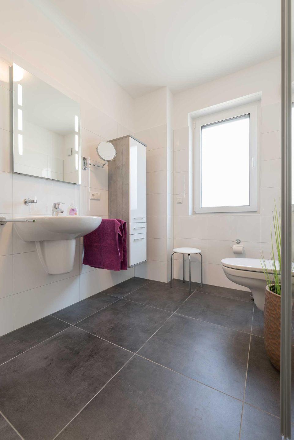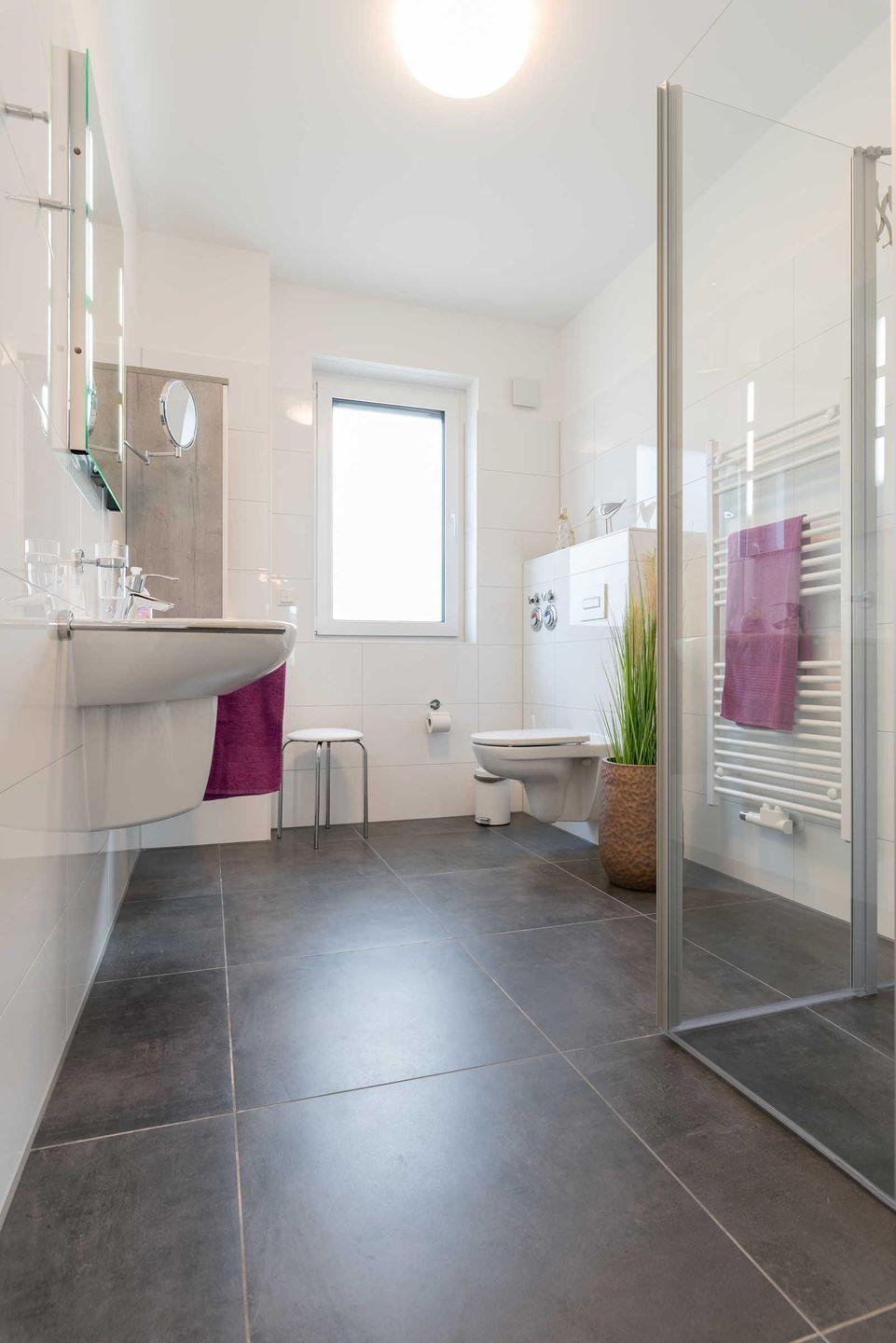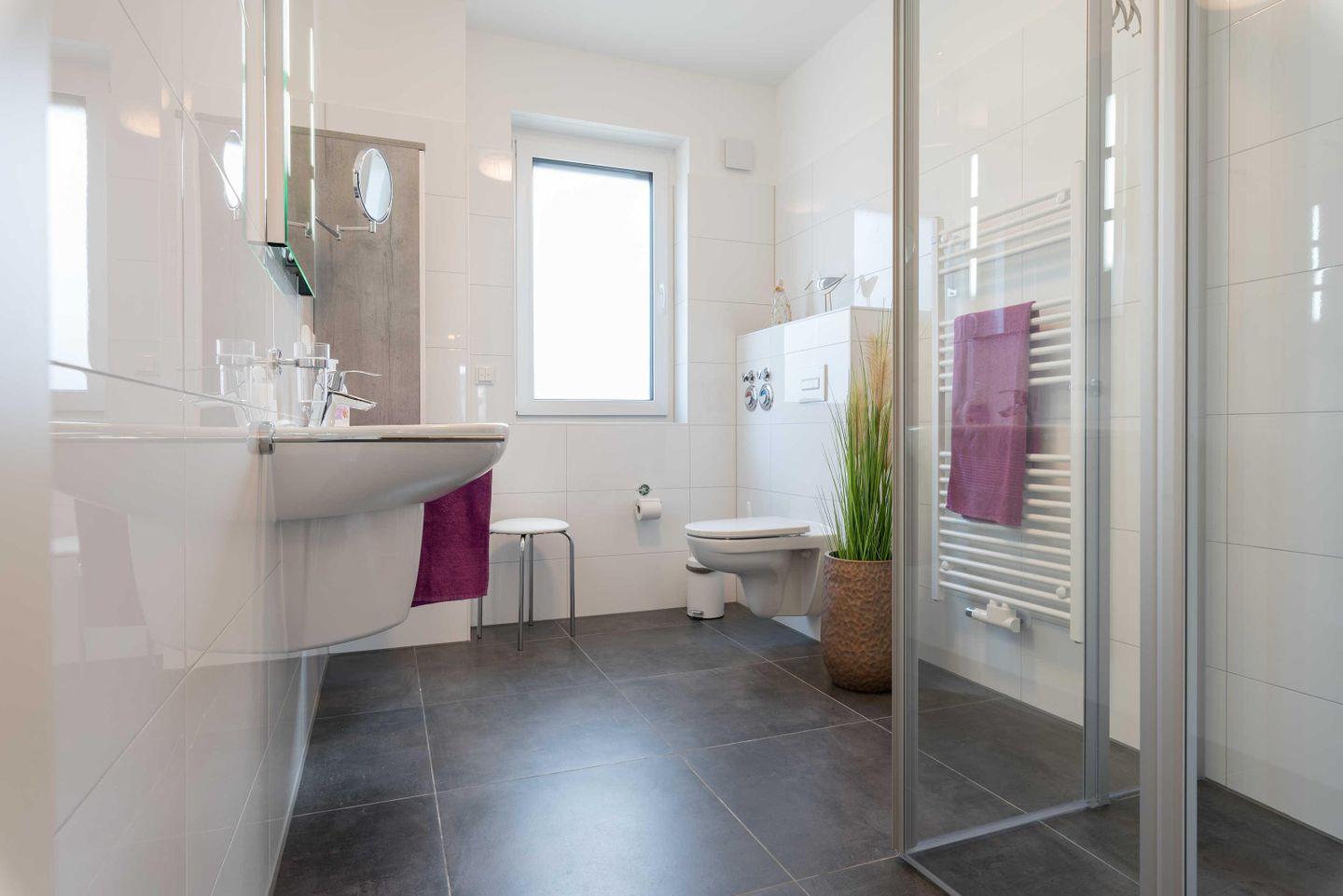 Das helle Tageslicht-Badezimmer besticht mit einer bodengleichen Dusche, einem