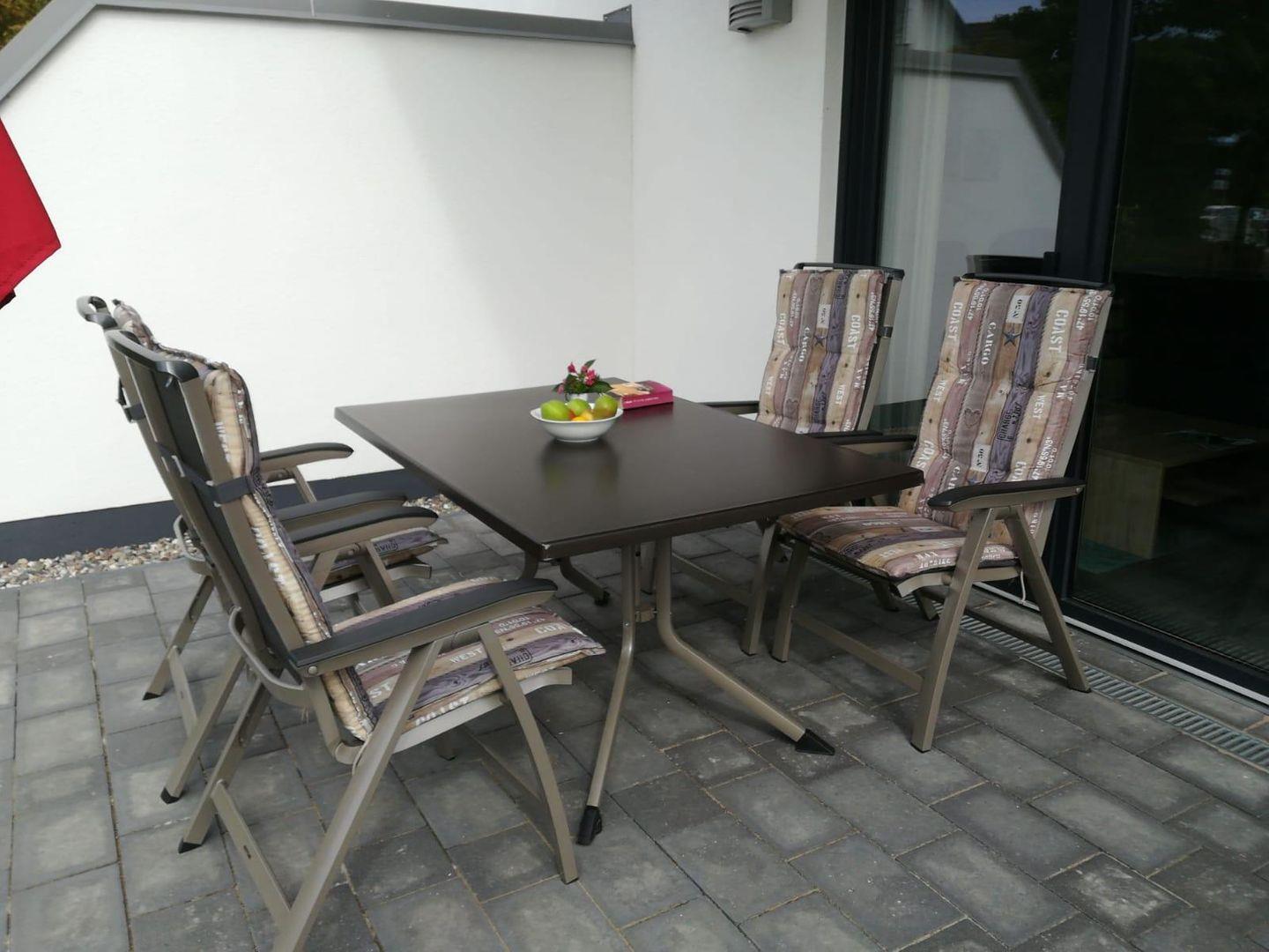 mit einem Tisch und vier Multipositionssesseln, zwei Relaxliegen, einem Hocker,