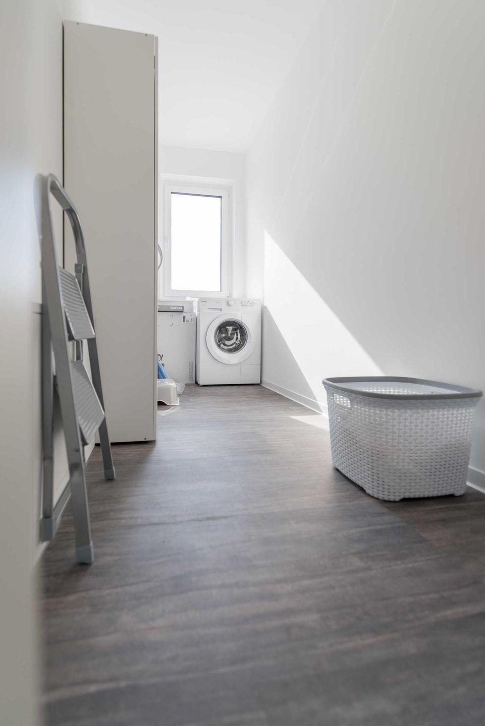 In dem in der Wohnung integrierten Abstellraum befinden sich eine Waschmaschine