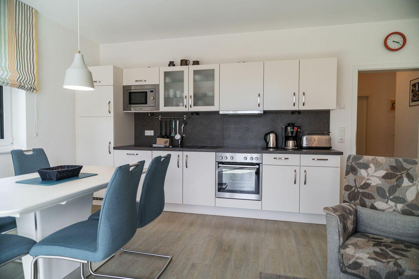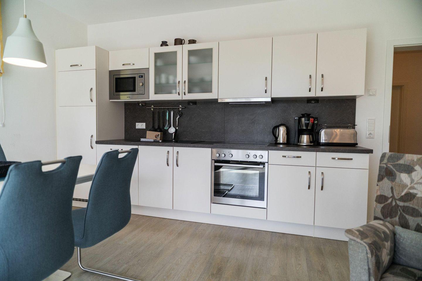 Die Einbauküche ist vol ausgestattet mit Geschirrspüler, Kühlschrank,