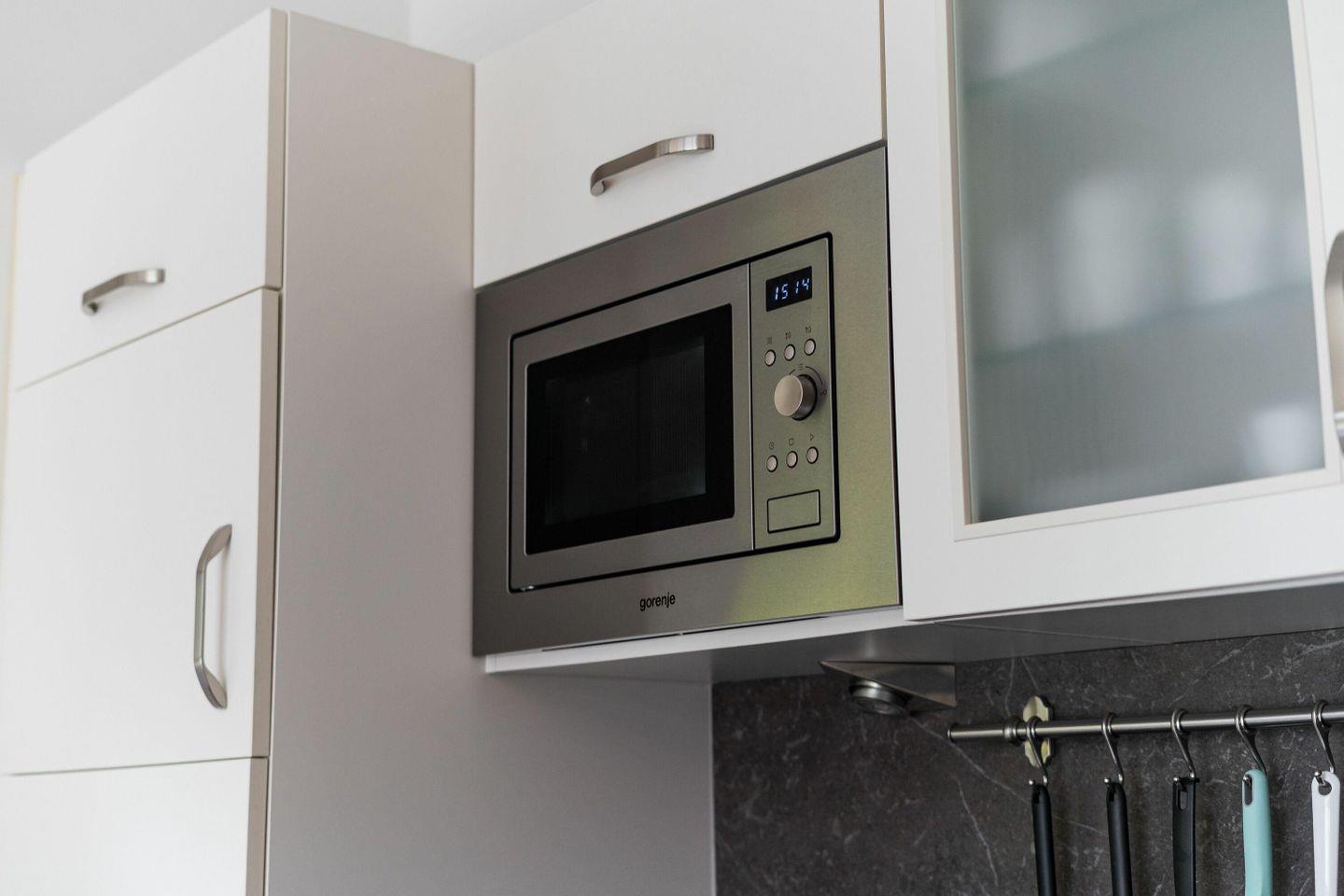 Mikrowelle. Geschirr und Gläser sind in ausreichender Anzahl vorhanden.
