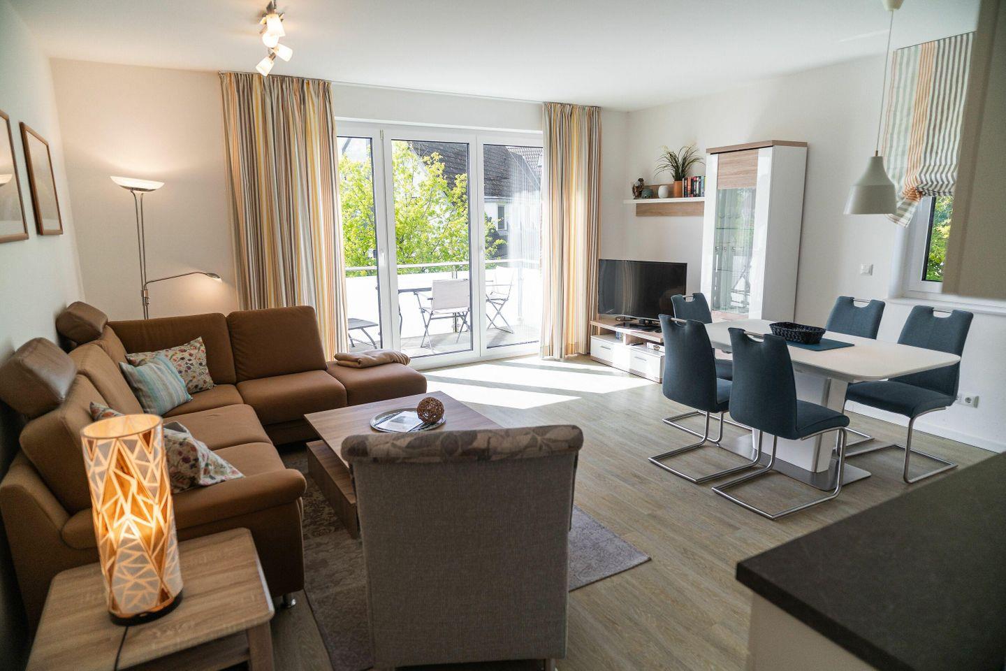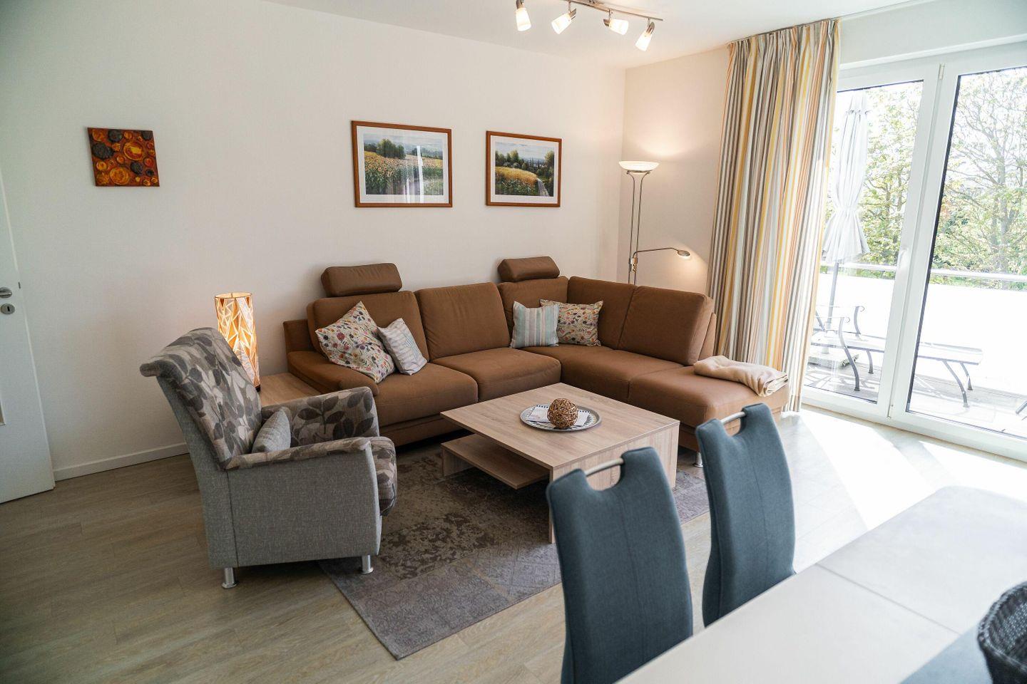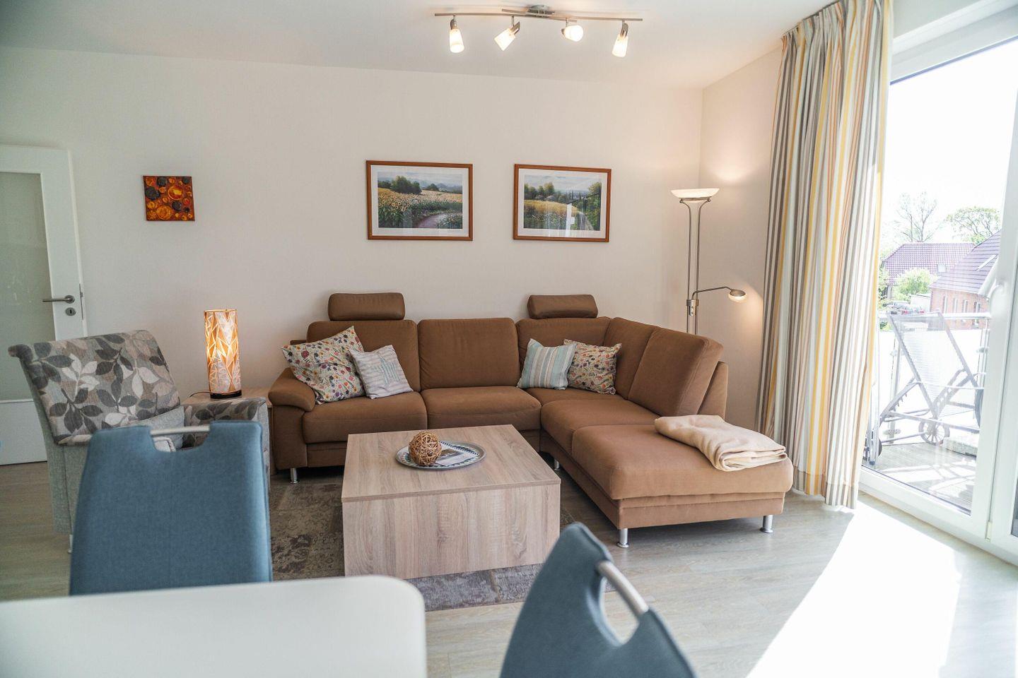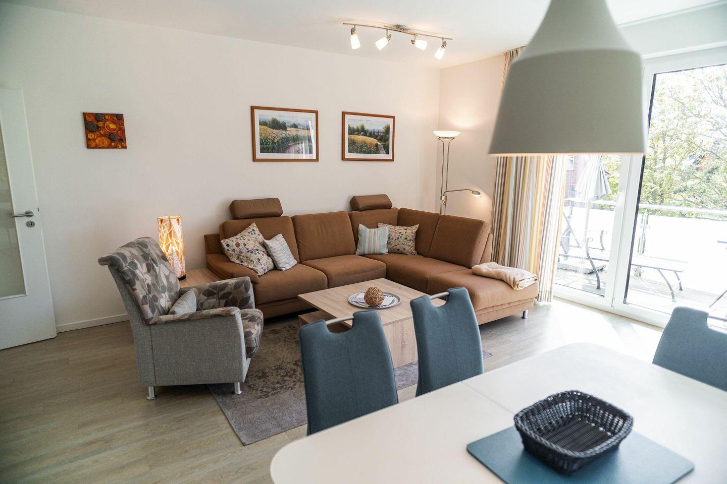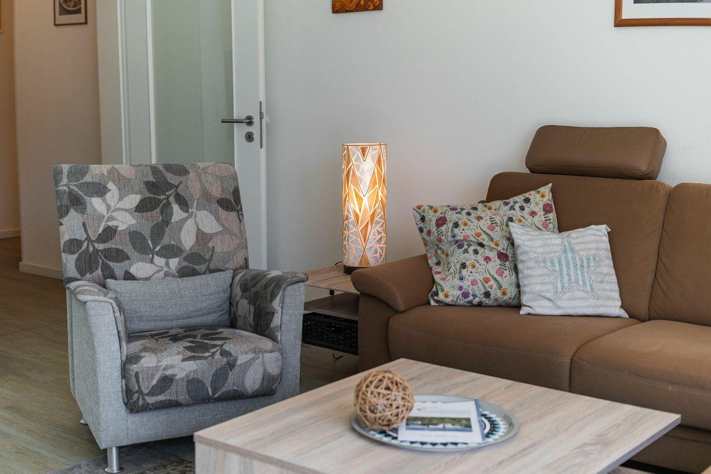 Im hellen und geschmackvoll eingerichteten Wohnzimmer laden eine gemütliche