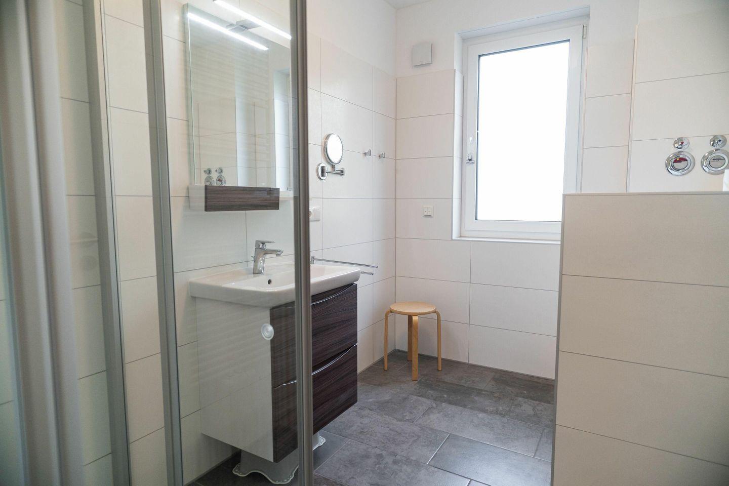 Das helle Badezimmer mit Fenster und bodengleicher Dusche verfügt über einen