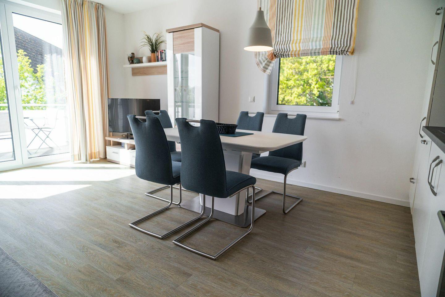 Eckcouch mit passendem Sessel sowie ein großer Esstisch, der für vier Personen