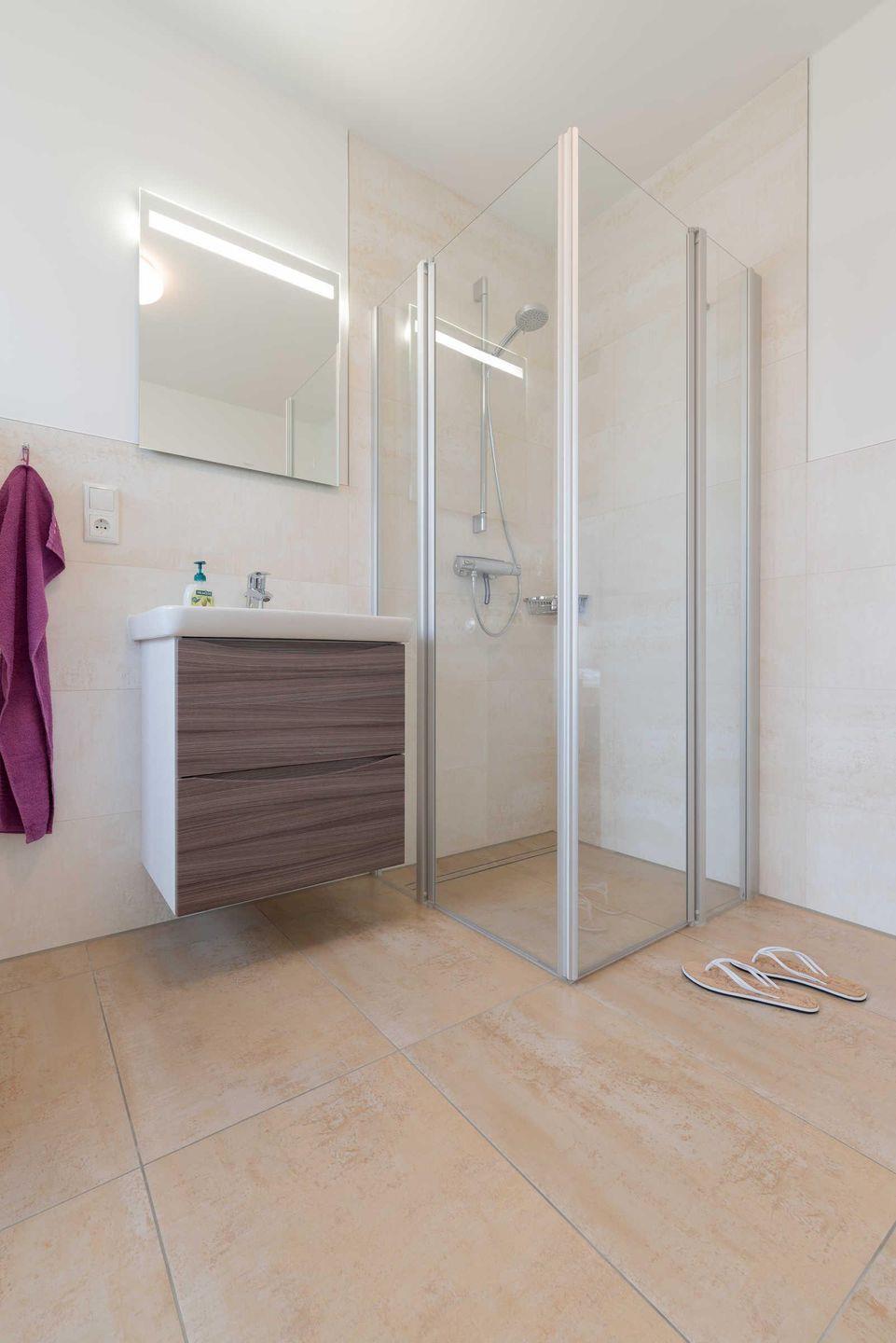 Das ca. 8 qm messende Bad ist mit einer geräumigen Dusche, einer Waschmaschine