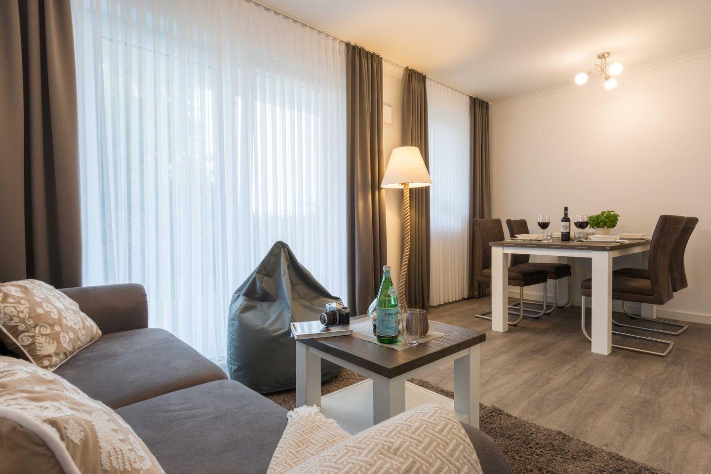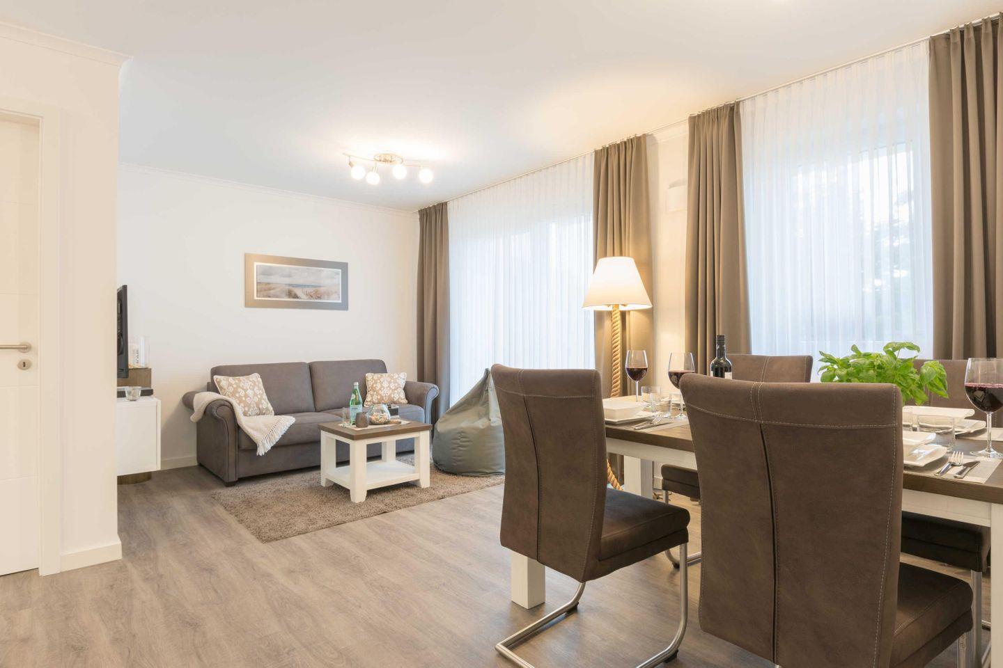 Die Ferienwohnung Villa Bonita WE 02 Ostseetraum in Börgerende bietet Strandnähe, Terrasse und Gartenblick für einen entspannten Urlaub.