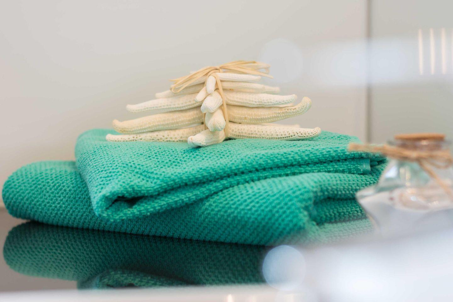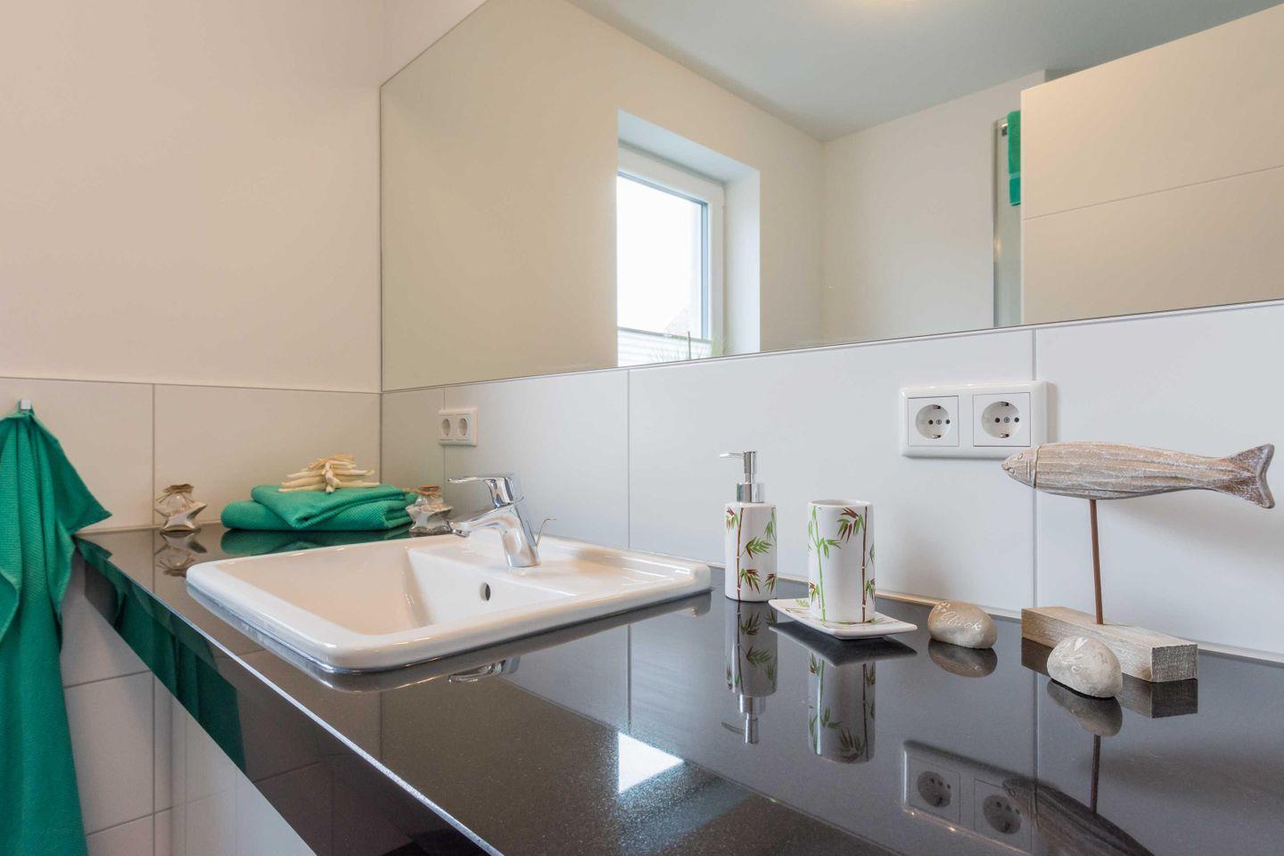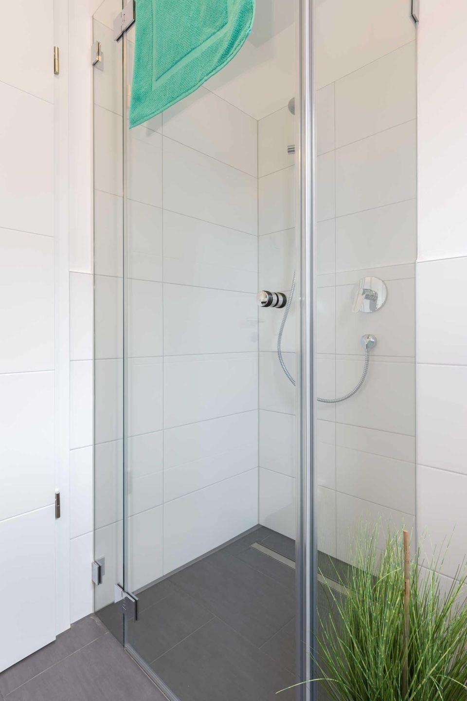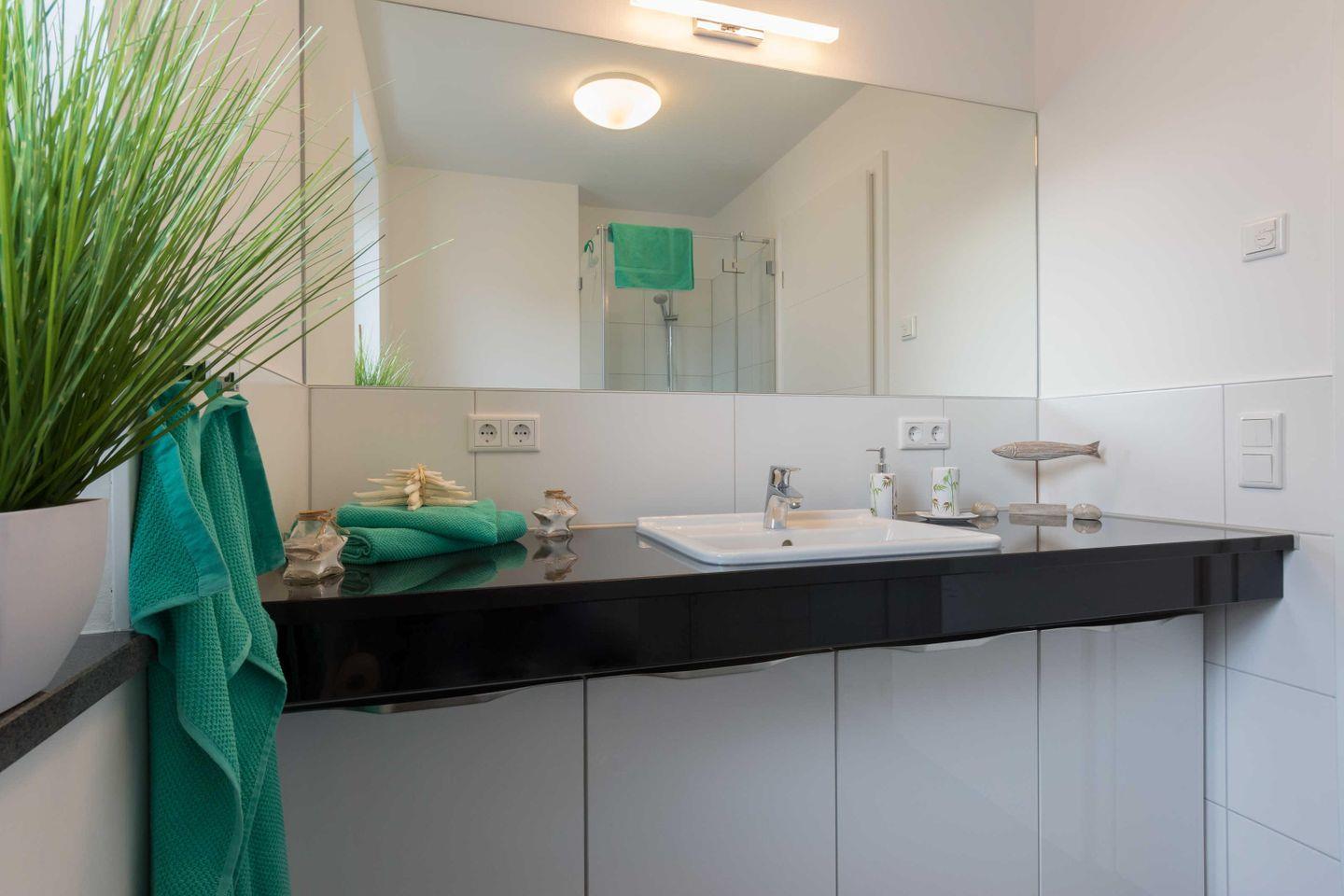 Das helle Badezimmer mit bodengleicher Dusche verfügt über einen großen Waschtisch mit großem Spiegel, eine Toilette und einen Ablageschrank mit Haartrockner. Im Abstellraum befinden sich ein Elektrogrill, eine Stranddecke und Strandspielzeug.