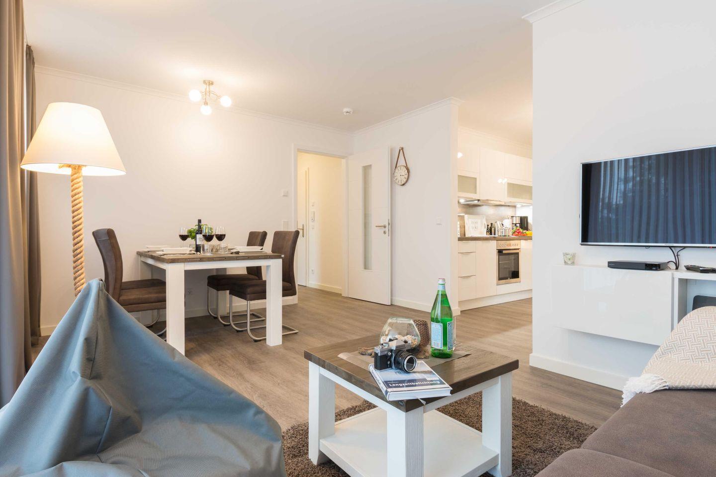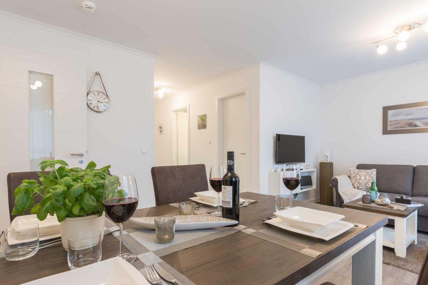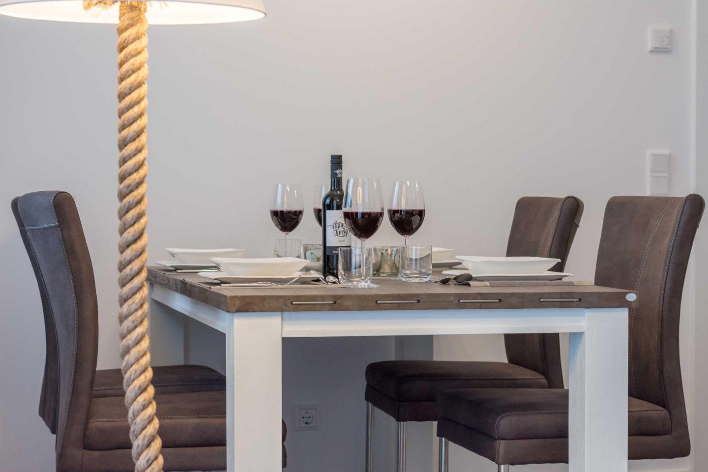 Die hochwertige Einbauküche verfügt über Kaffeemaschine, Toaster, Wasserkocher, Kühlschrank, inklusive Tiefkühlfach, Geschirrspüler und Cerankochfeld mit vier Platten. Der große Esstisch mit vier bequemen Stühlen ermöglicht gemütliches Essen und ist auch bestens geeignet für gesellige Spieleabende.