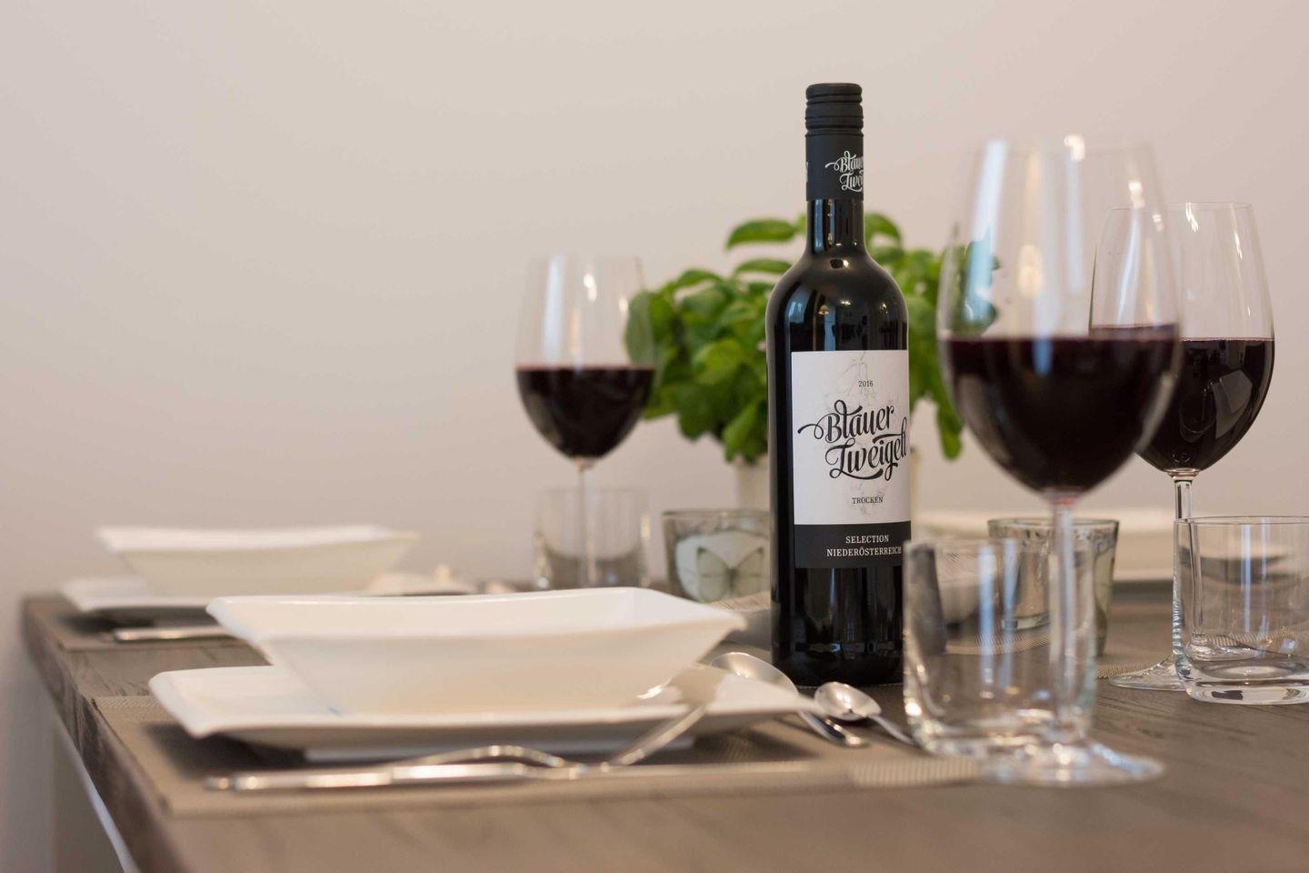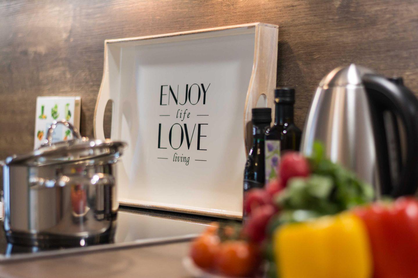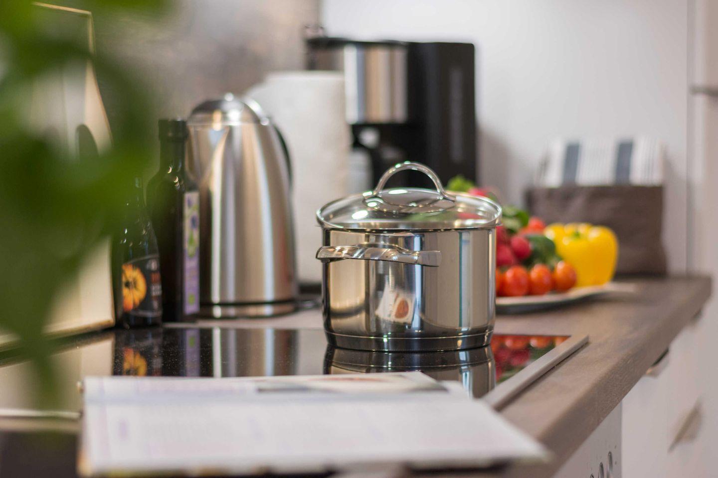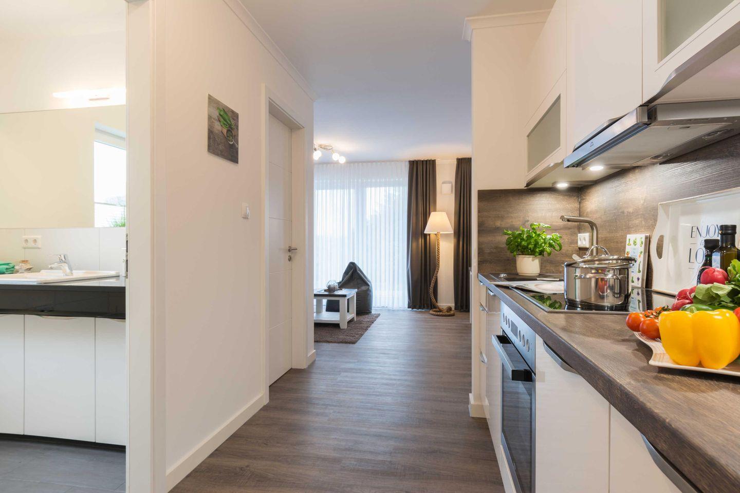 Die hochwertige Einbauküche verfügt über Kaffeemaschine, Toaster, Wasserkocher, Kühlschrank, inklusive Tiefkühlfach, Geschirrspüler und Cerankochfeld mit vier Platten. Der große Esstisch mit vier bequemen Stühlen ermöglicht gemütliches Essen und ist auch bestens geeignet für gesellige Spieleabende.
